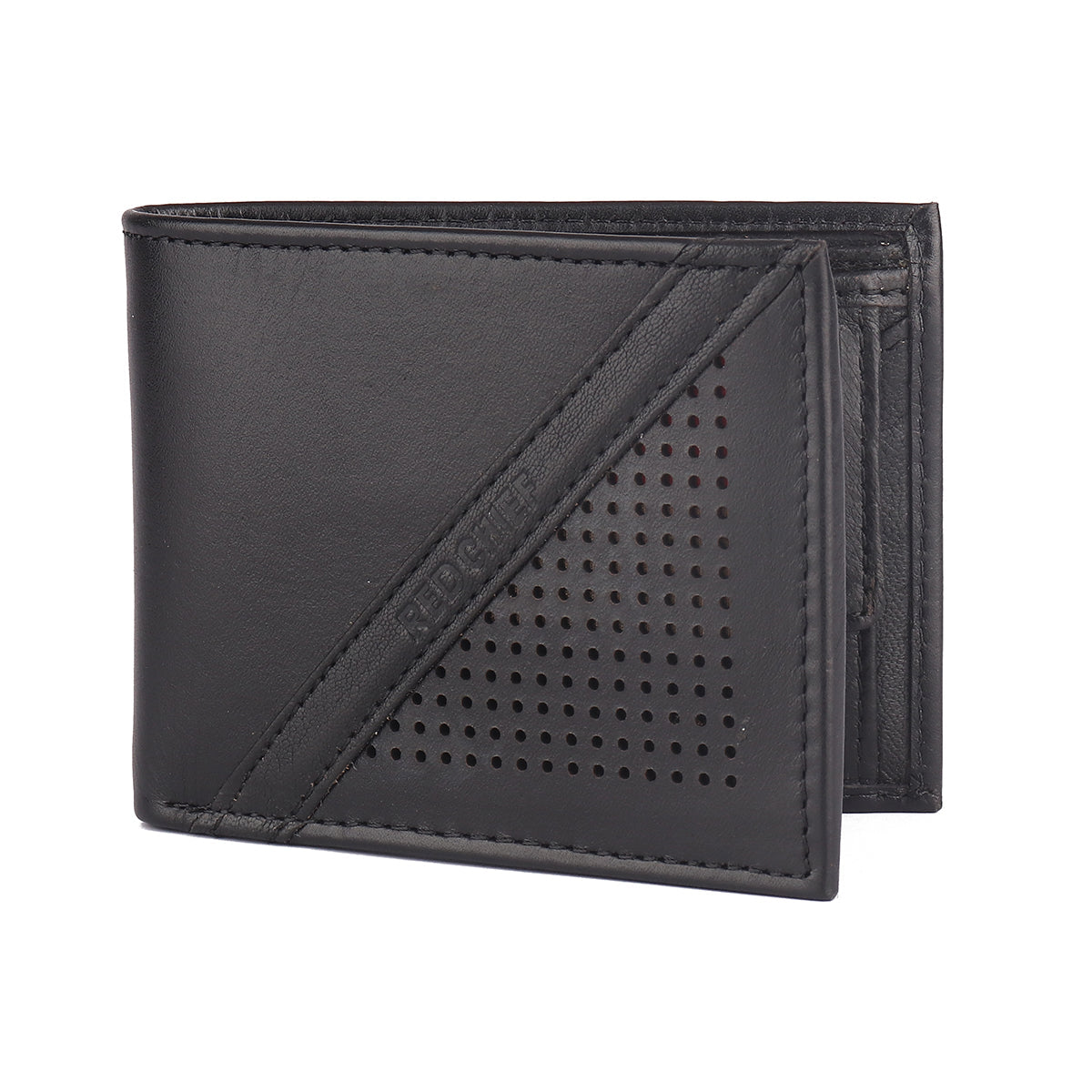 A well-built and premium-quality leather wallet in classic black colour by Red Chief. This sturdy bi-fold wallet features diagonal perforation and branding on the front for a chic exclusive touch. It opens up to a roomy interior helping you to hold your cash and cards in a neat and organised way.