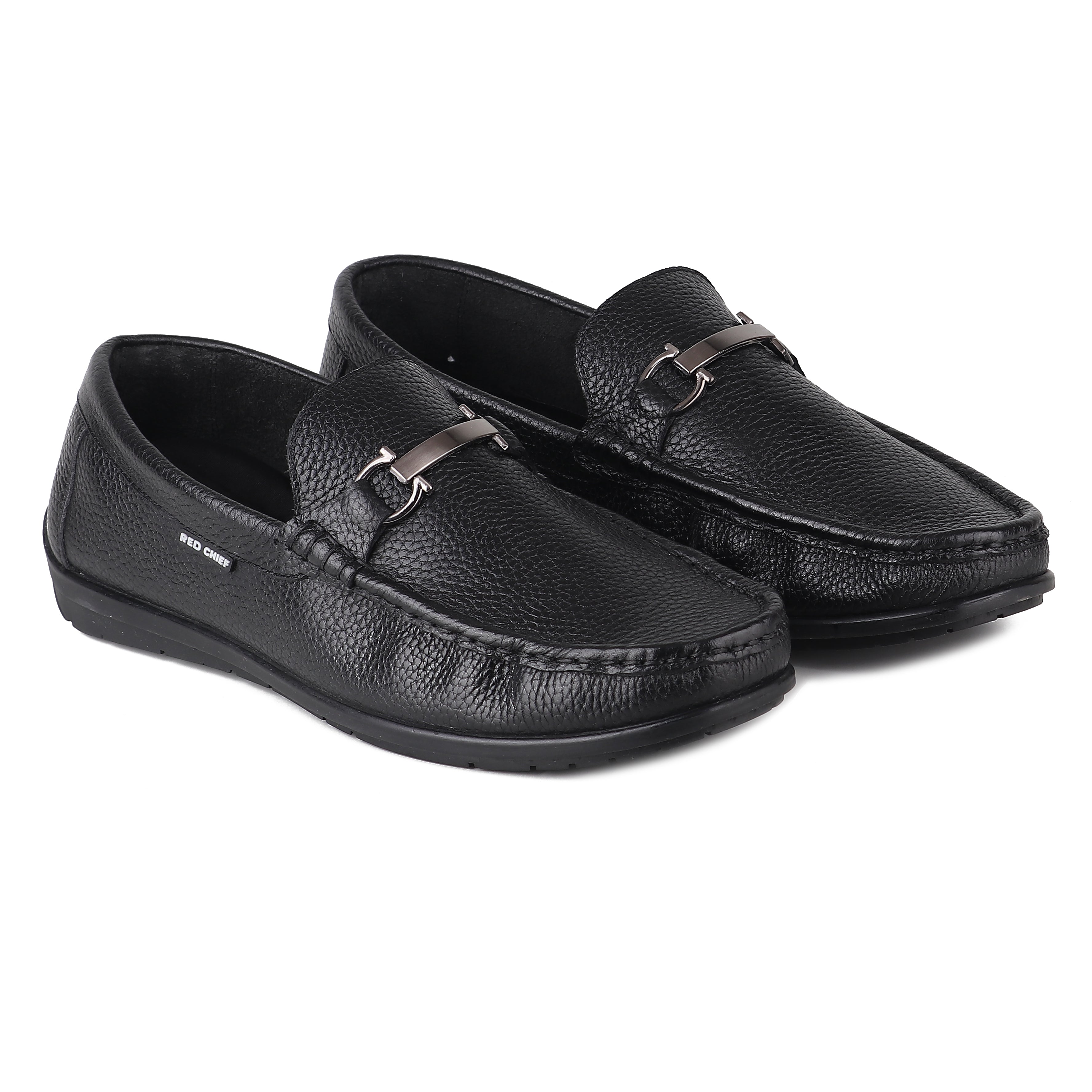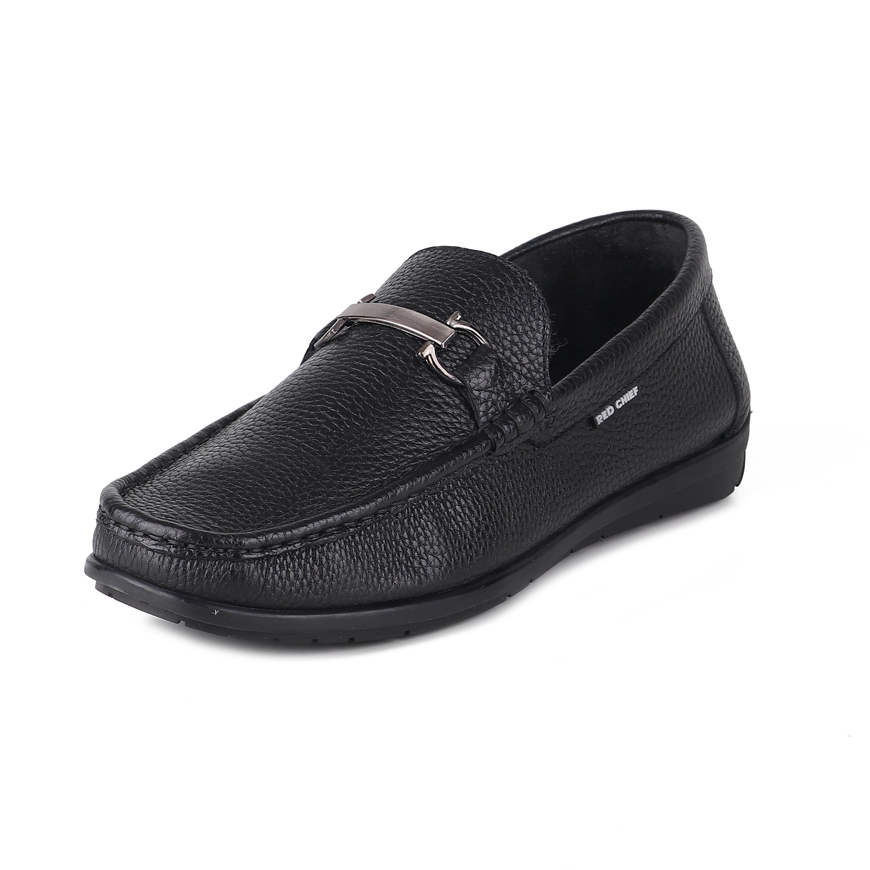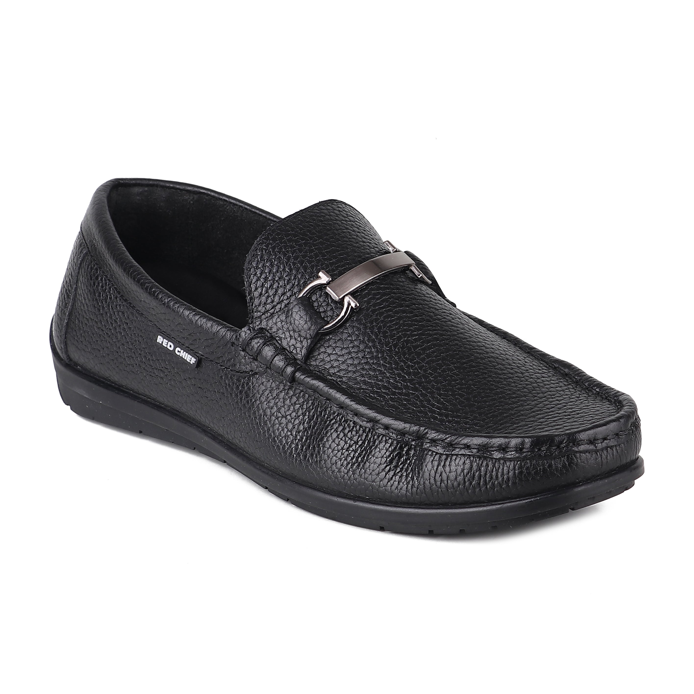 THIS MEN'S BOOTS IS FOR:- Red Chief brings you black loafers crafted in durable ox floater leather, known for its rich texture and longevity. The mock-stitched toe and metal saddle add a classic touch, ideal for both office and casual settings.