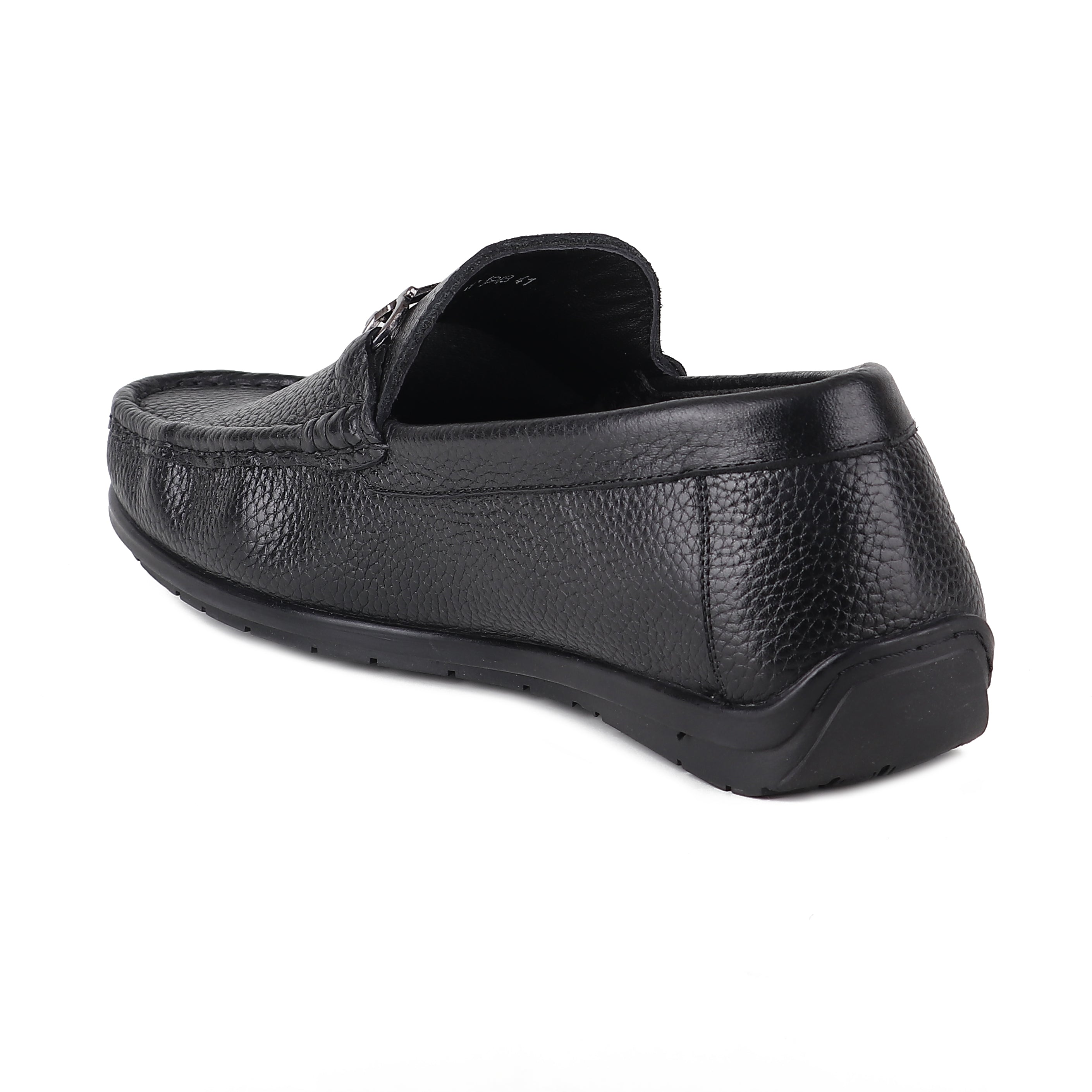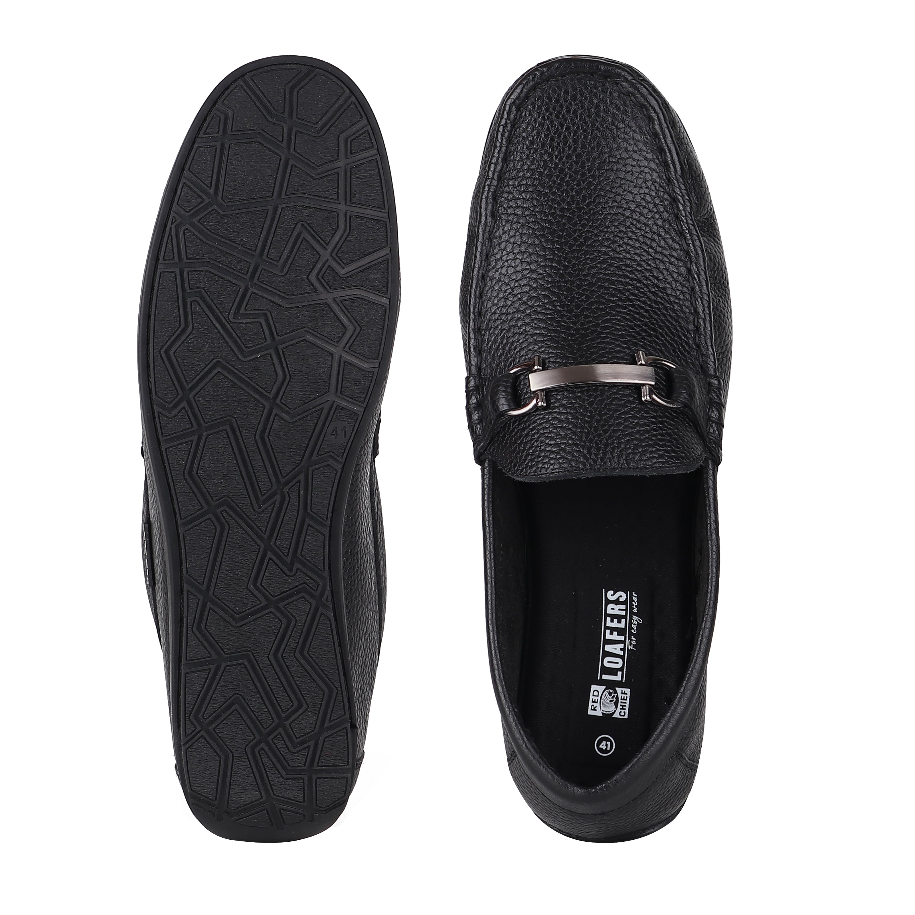 Benefits: RC3948 001 A pair of black Loafers shoe is made in high quality ox floater leather which known for its durability and rich textured. The moc stitch on toe with metal saddle adds a classic element but also elevates the loafer's design, suitable for office and casual wear. The shoe is unlined which is breathable and provide a smooth wear feel for daily regular use. TPR outsole with excellent flexibility, Slip Resistance and durability properties. Molded soft cushioning insocks inserted.