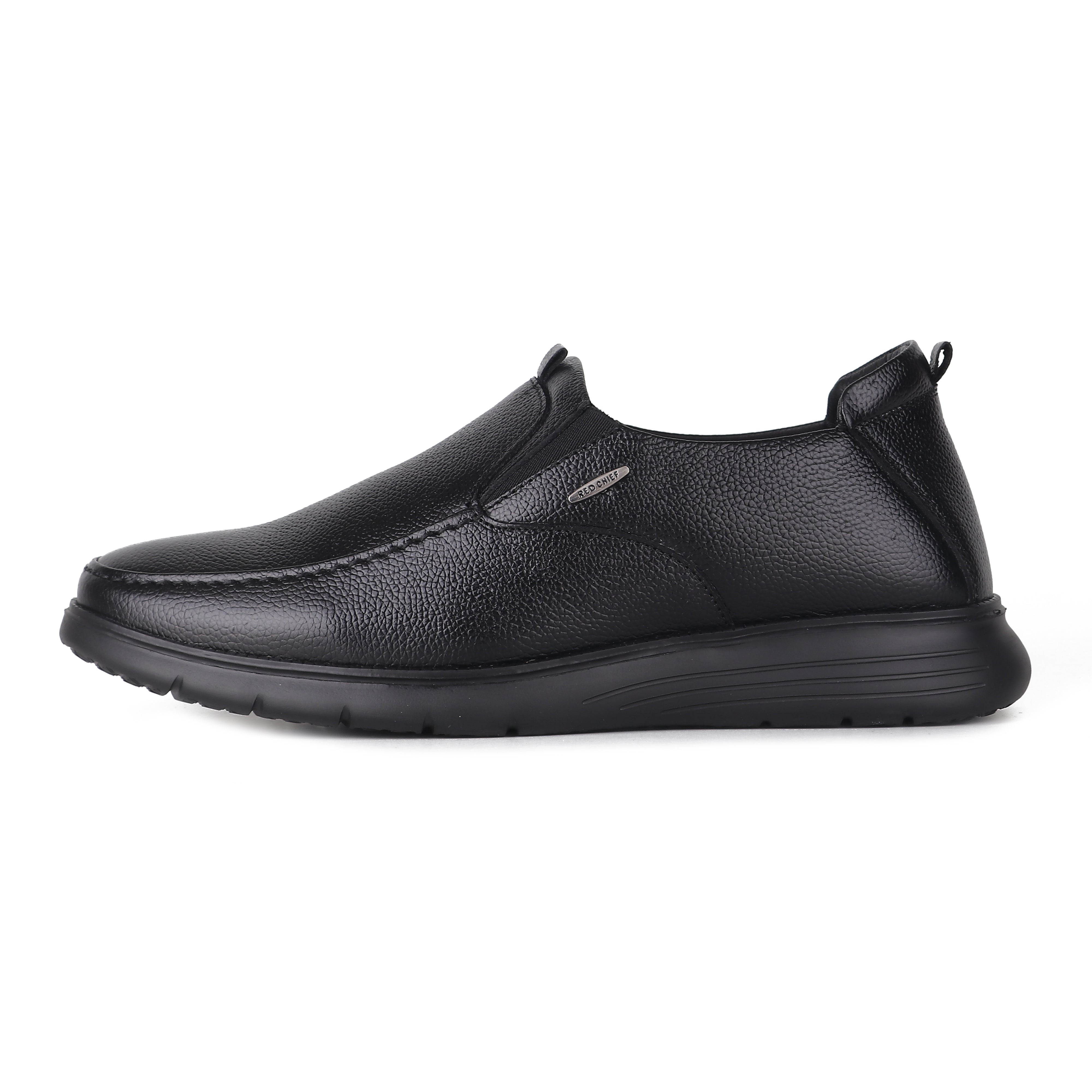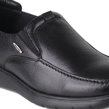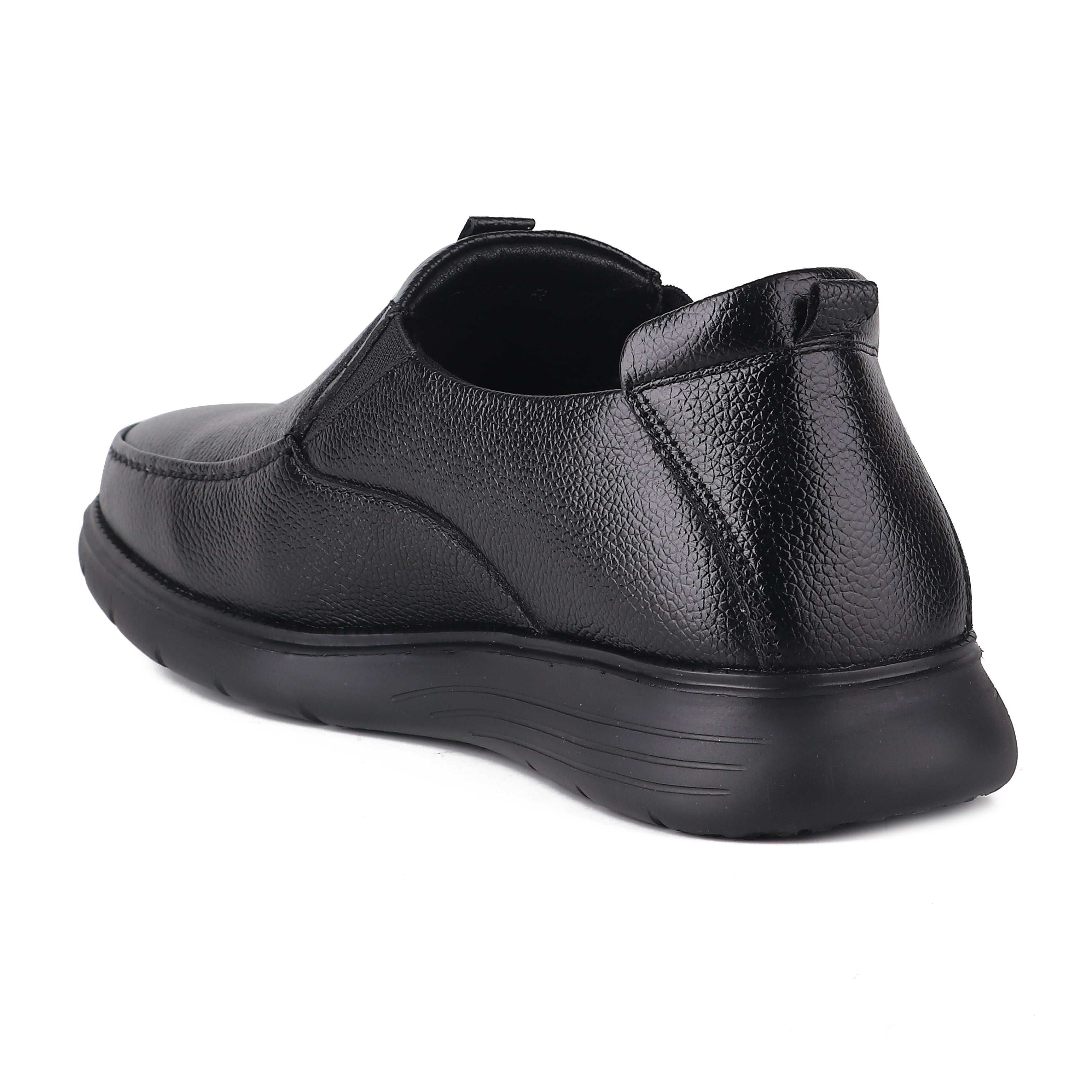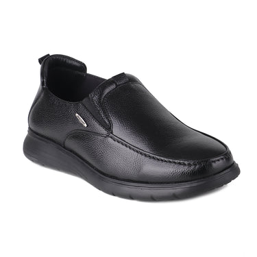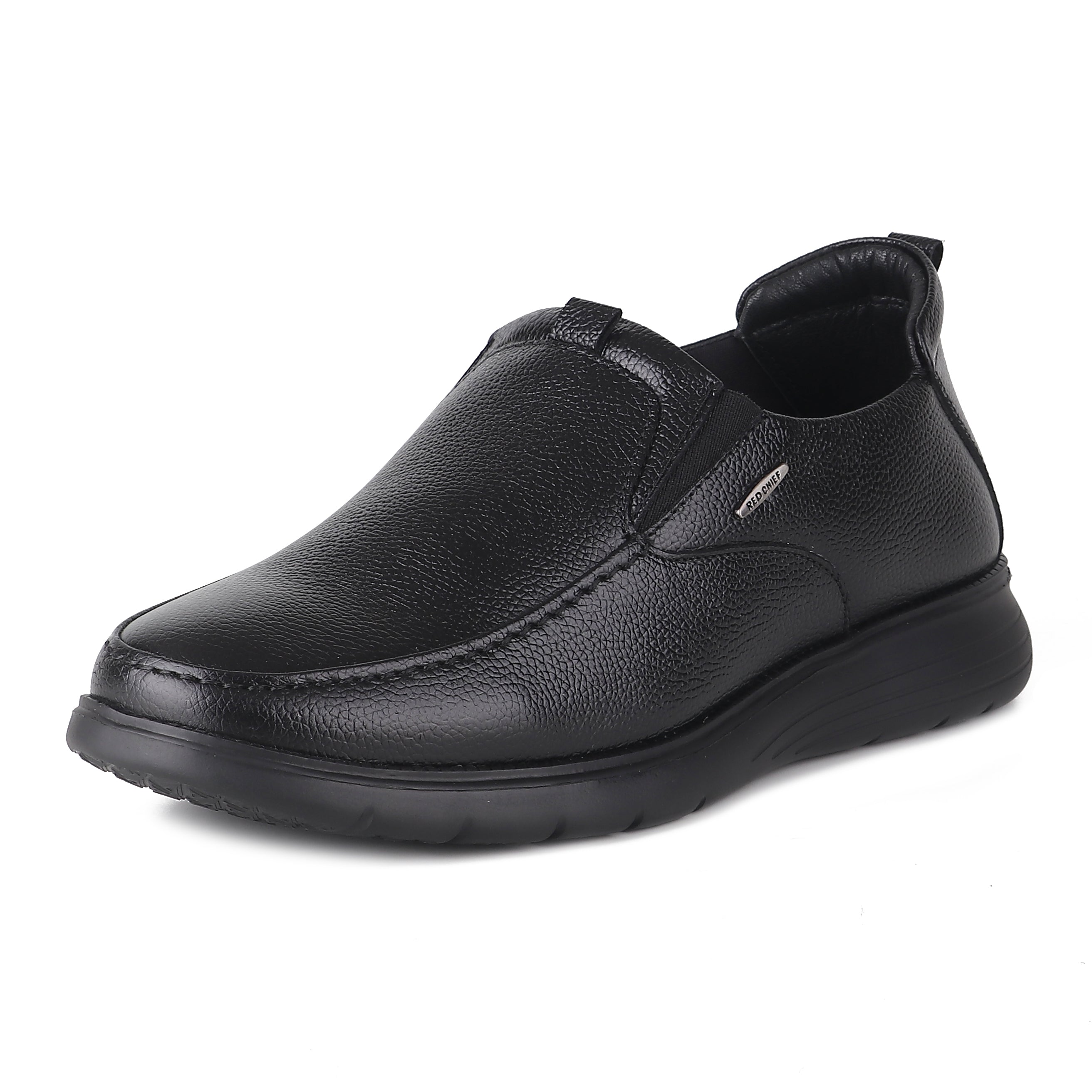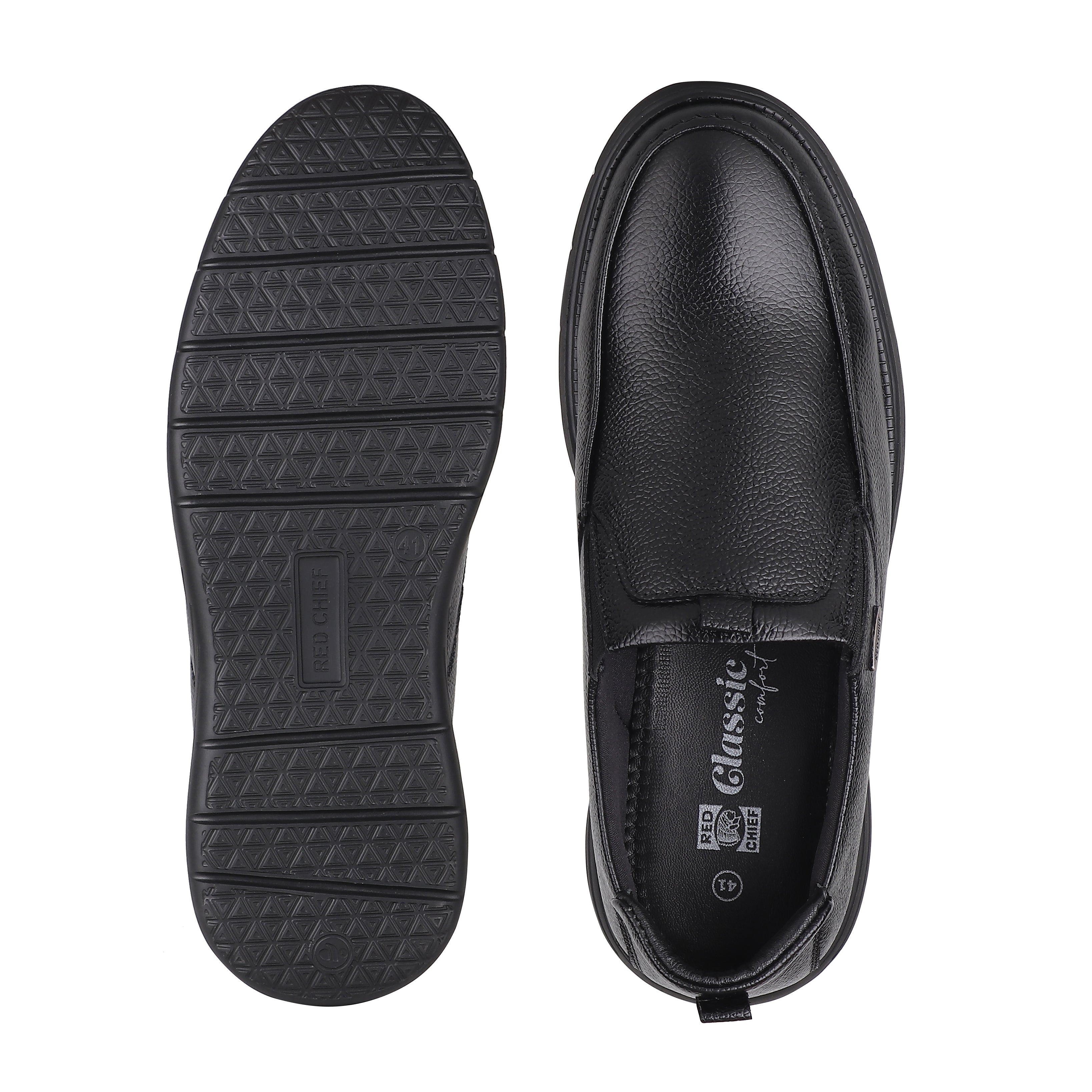 Crafted from ox-milled leather, these Red Chief black slip-on formal shoes offer both comfort and durability. The cushioned back collar ensures a smooth, breathable fit, while thick stitching on the vamp adds a stylish touch. Featuring a soft skin-fit lining for everyday comfort, the lightweight EVA outsole provides excellent grip, flexibility and slip resistance.