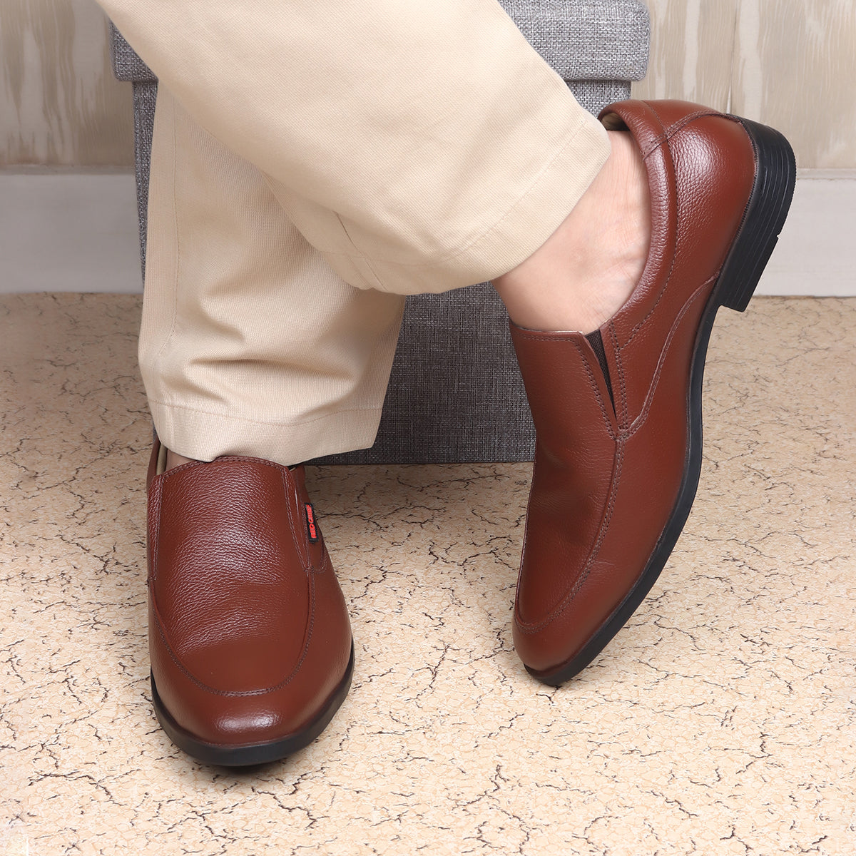 A must-have in every gentleman’s footwear collection, these tan formal slip-on shoes by Red Chief have a classic lace-free silhouette with edgy vibes. These shoes have flexible TPR outsoles and super comfortable insole assuring stable steps on every terrain. These shoes work well with a tuxedo as well as a button-down shirt.