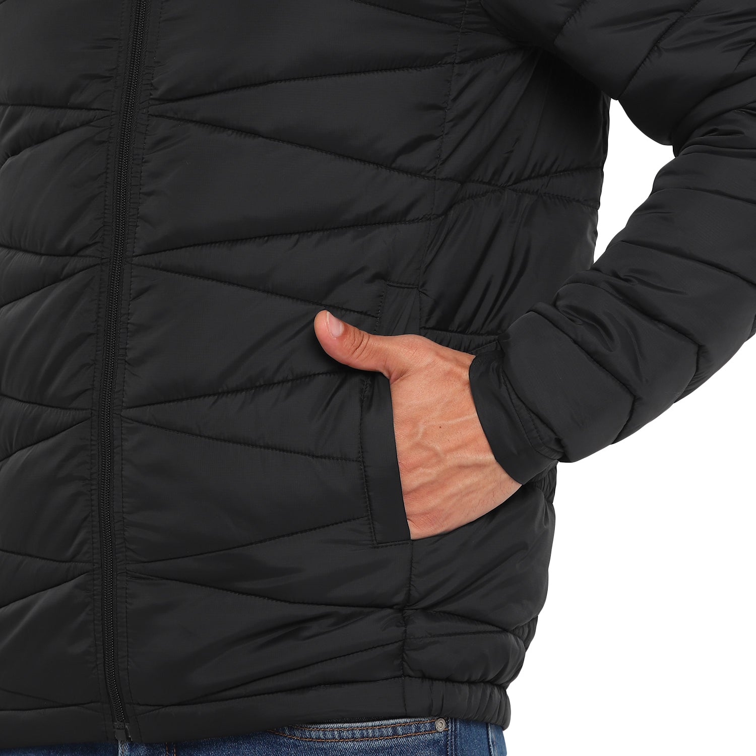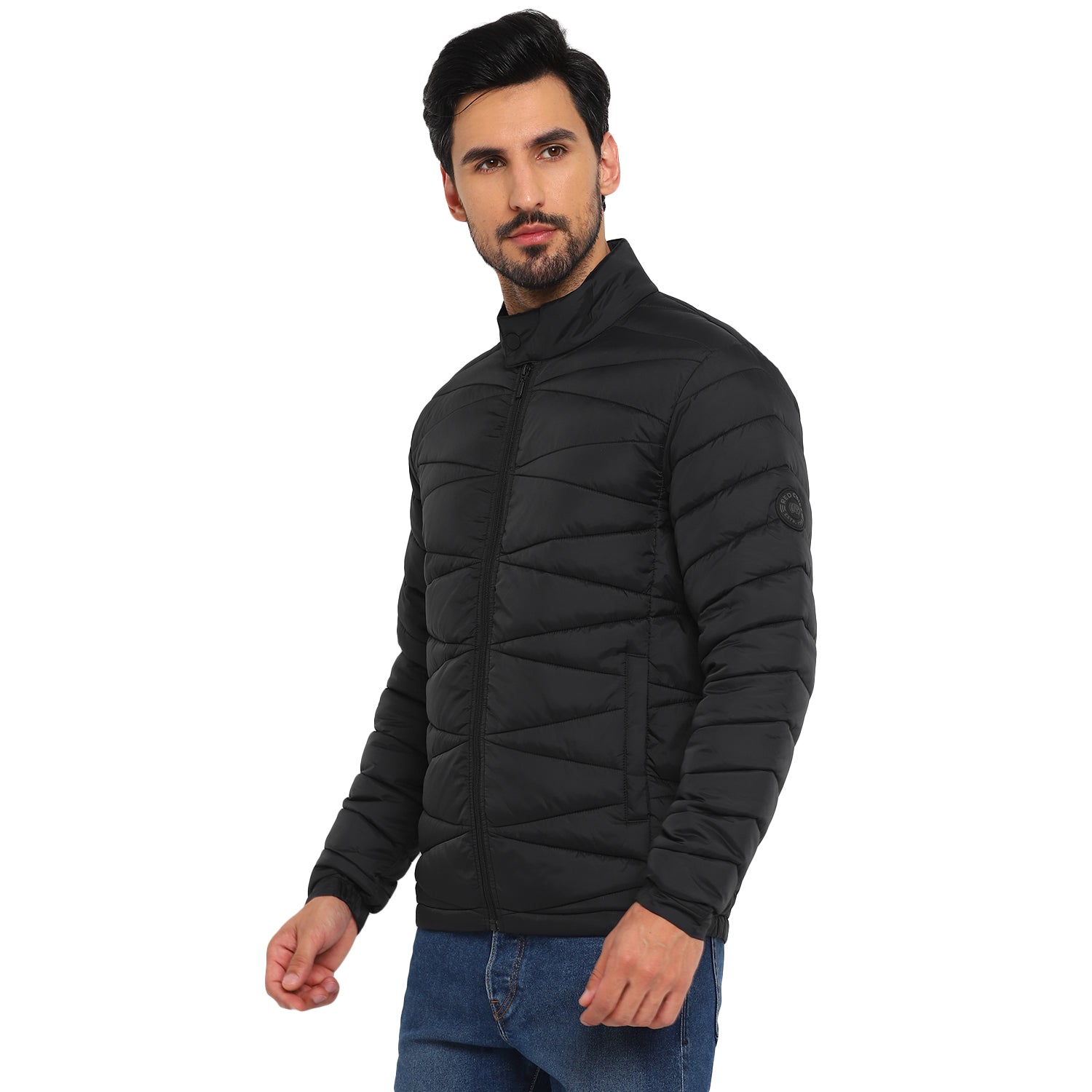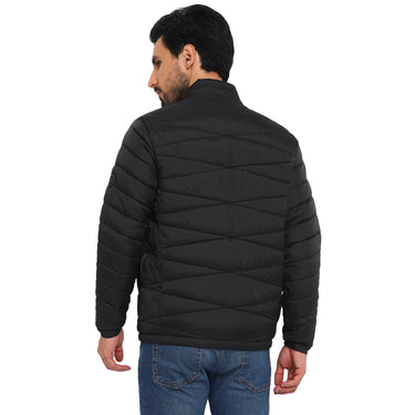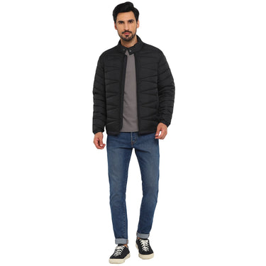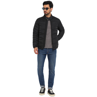 A black quilted puffer jacket to keep you warm and comfortable in the dipping temperatures. Besides the pattern, this regular-fit Red Chief jacket also features a funnel collar with a snap button, front zipper closure, and multiple pockets assuring an easy fit and good functionality. This lightweight jacket also features silicon rubber branding on the sleeves for an elite touch. Wearable with any jeans, this jacket is a winter wardrobe essential. This packable jacket comes with a bag too.