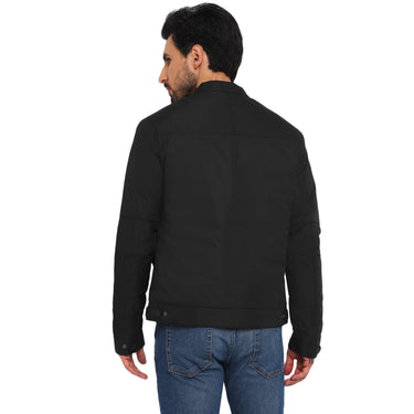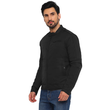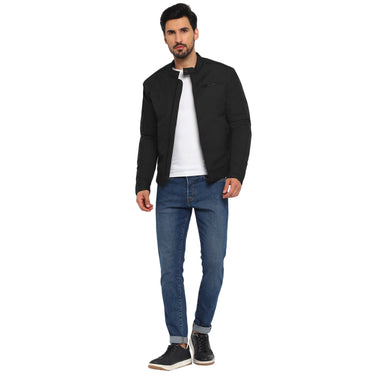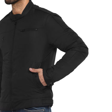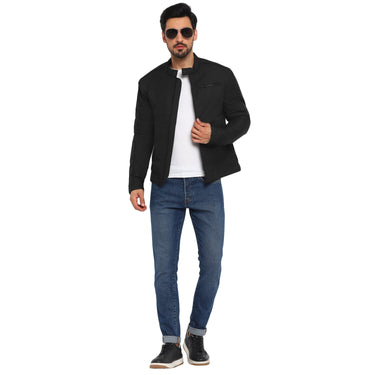 Featuring a vertical quilted pattern on the shoulder and back yoke, this black Red Chief biker jacket is all you need for a cool, contemporary look. This funnel collar jacket also features an adjustable belt at the waist and sleeves with metal branding buttons for a snug fit and added style. Further, its polyester dobby base fabric ensures a comfortable fit. Finished with bike metal branding at the right chest, the jacket looks amazing with jeans and boots.