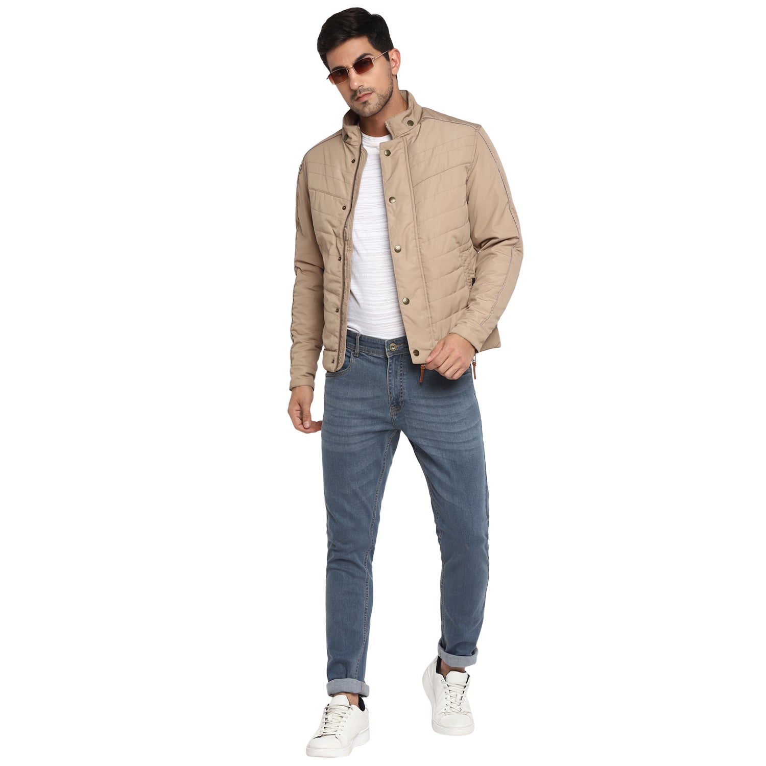 With an urban silhouette with edgy vibes this beige-coloured all-over diagonally quilted biker jacket is confident and versatile. Besides the quilted pattern it also features tonal piping across shoulders and sleeves and camouflage printed lining for added style and appeal. This jacket is further designed with twin-side front pockets for good utility. Team this comfortable jacket with light-washed denims and boots to stand out. This jacket is dry cleanable only.