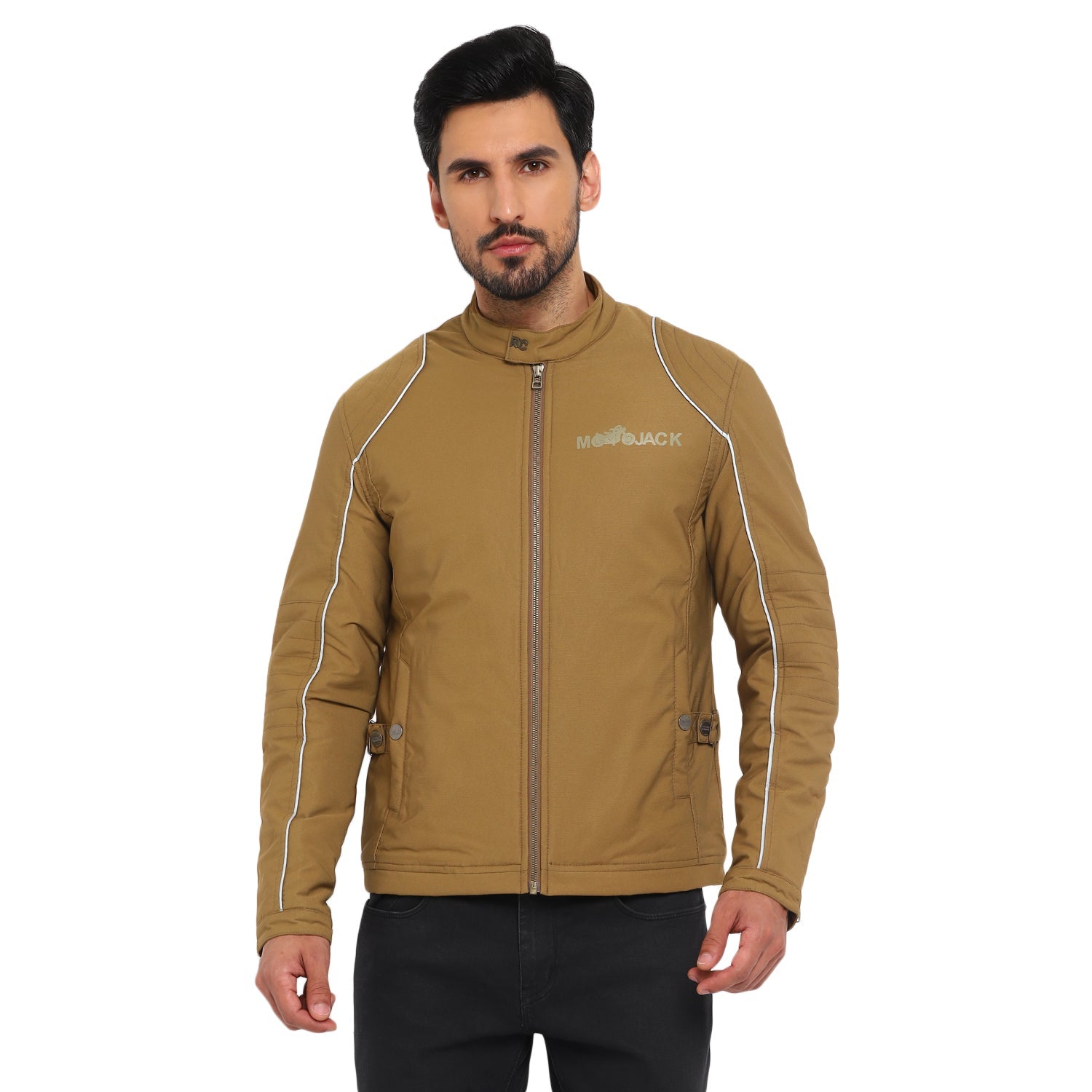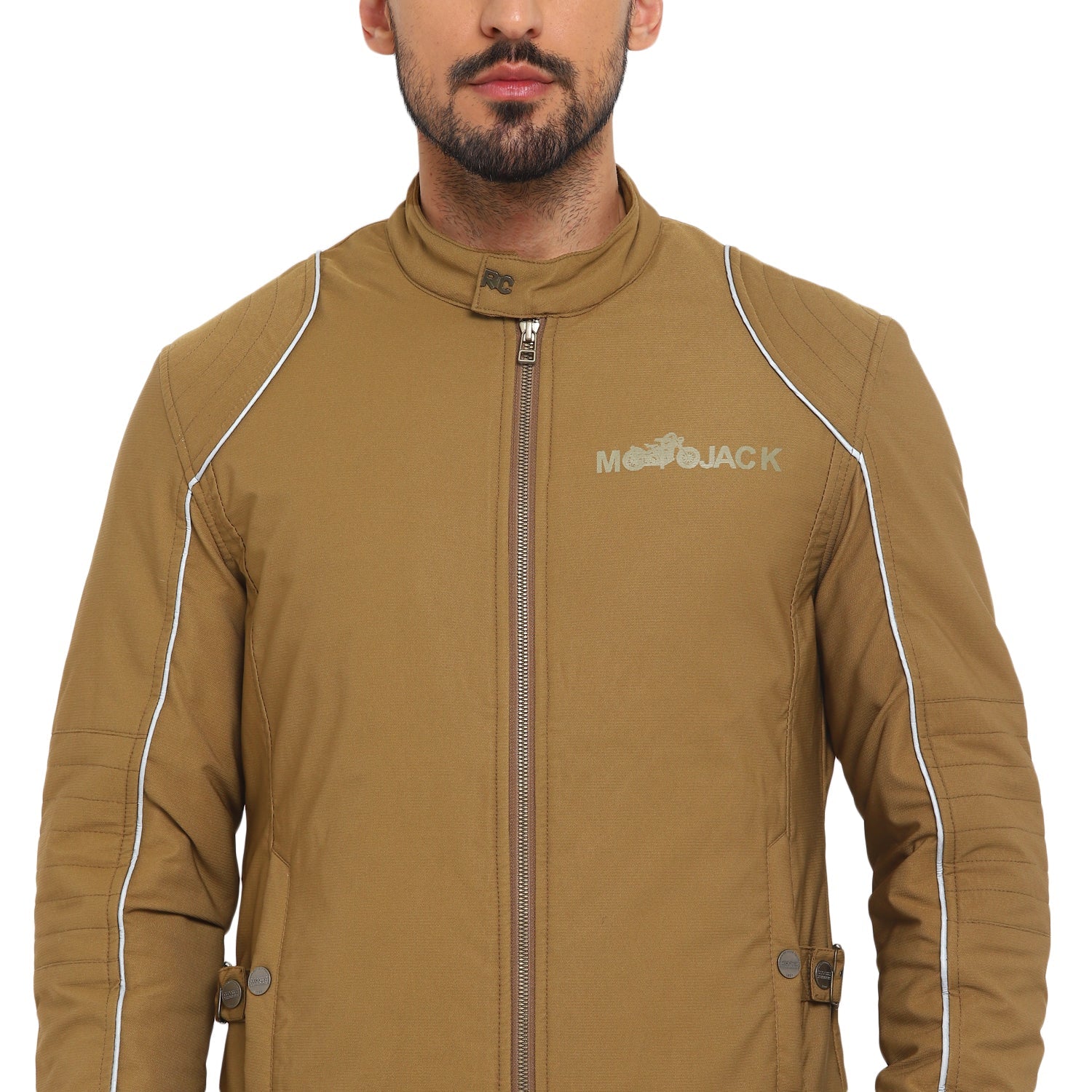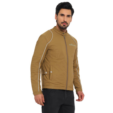 A trendy and functional biker jacket in classic khaki. This Red Chief casual jacket comes in a solid pattern complemented by reflector cord piping on the shoulder and sleeves, making it visible even in the dark. Having polyester textured dobby base fabric with motojack print on the chest, this comfortable jacket looks fantastic with any jeans or chinos.