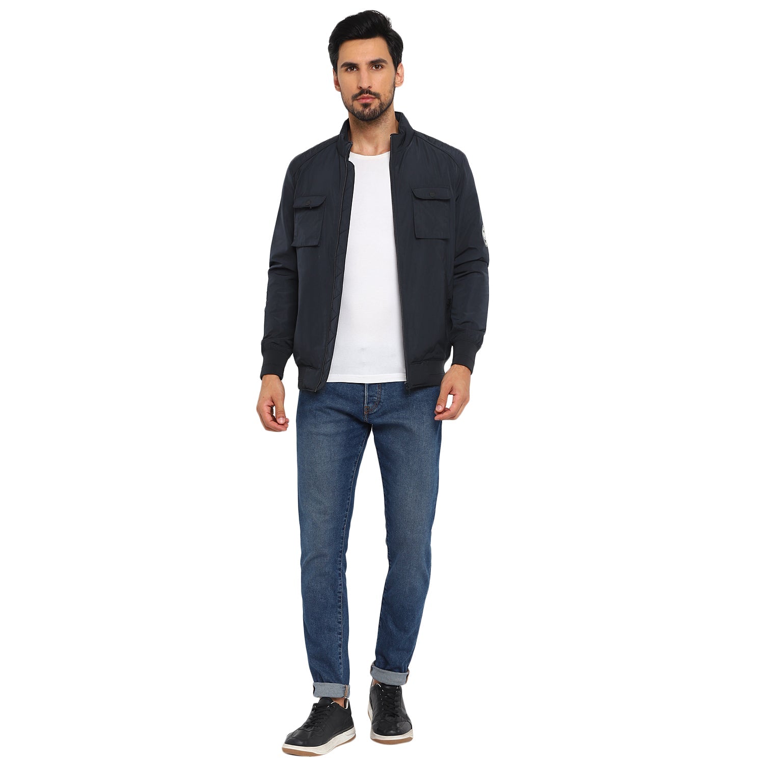 Lightweight and classy in nature, this dark navy casual jacket by Red Chief has a clean profile with cord piping and vertical quilting on the shoulder panels. It also features chest pockets with snap buttons for good functionality, and silicon branding on the sleeve for elite vibes. Wearable with almost every jeans and chinos, the jacket is a must-have in your closet.