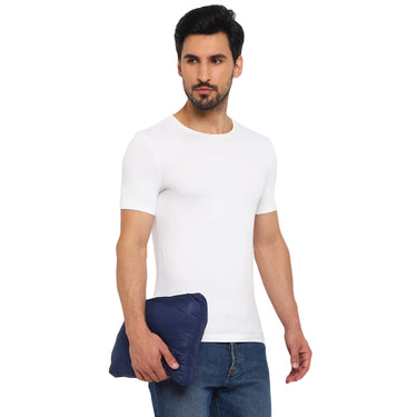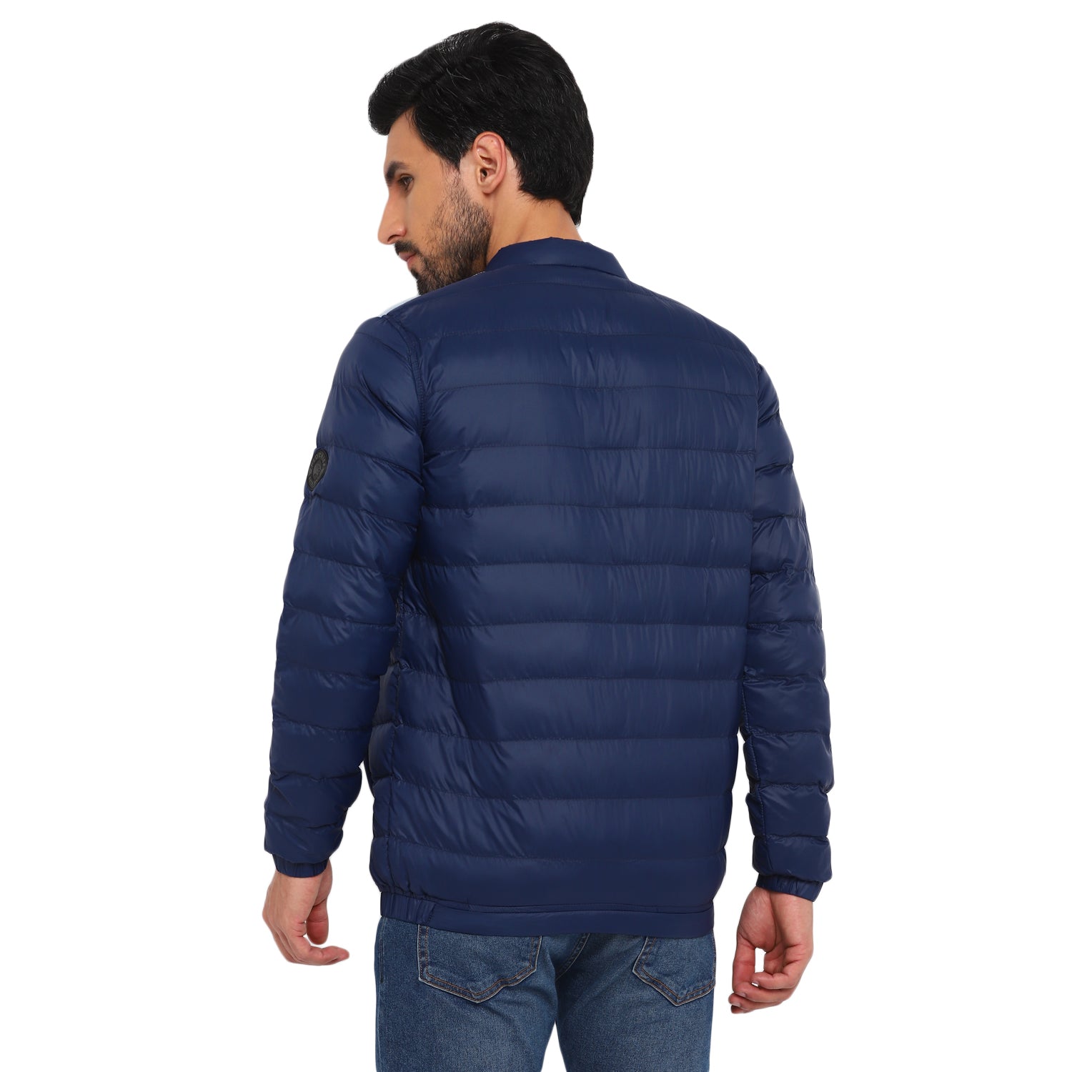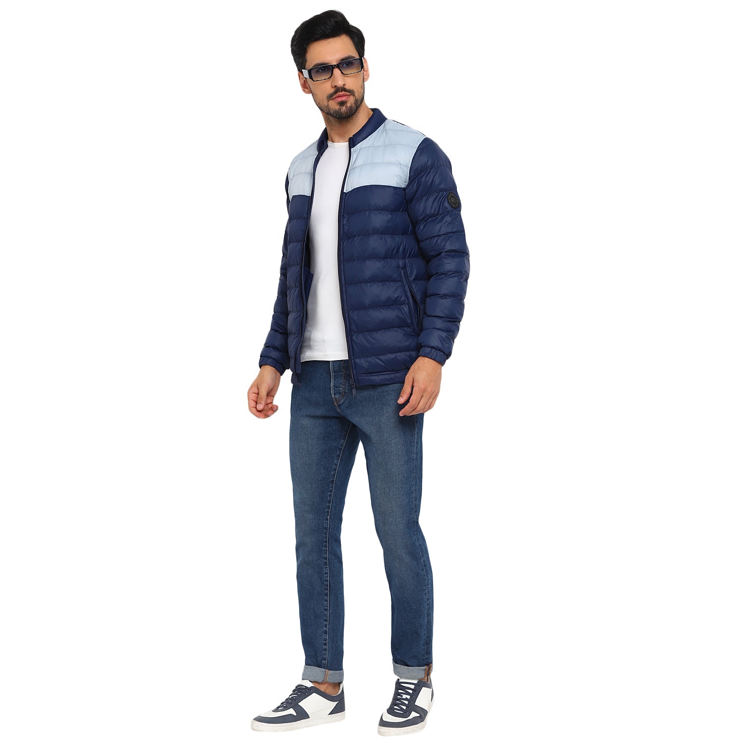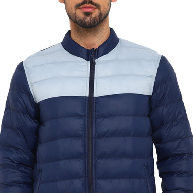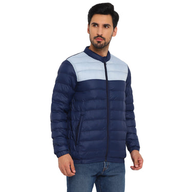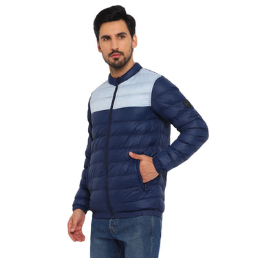 A colour-blocked quilted jacket that assures style and warmth at once. Designed in a horizontal quilted pattern, this blue packable jacket has a nylon base plain weave fabric complemented by a funnel collar and multiple pockets to keep you warm and cosy all day long. The elasticated bottom hem and sleeve cuffs further ensure a snug fit. The silicon brand patch on the sleeve speaks for the exclusivity of this jacket and it looks great with blue jeans and cool kicks.