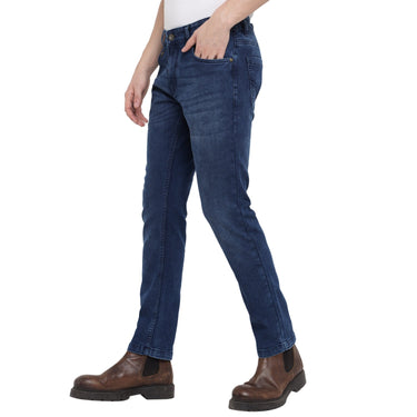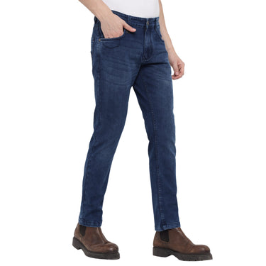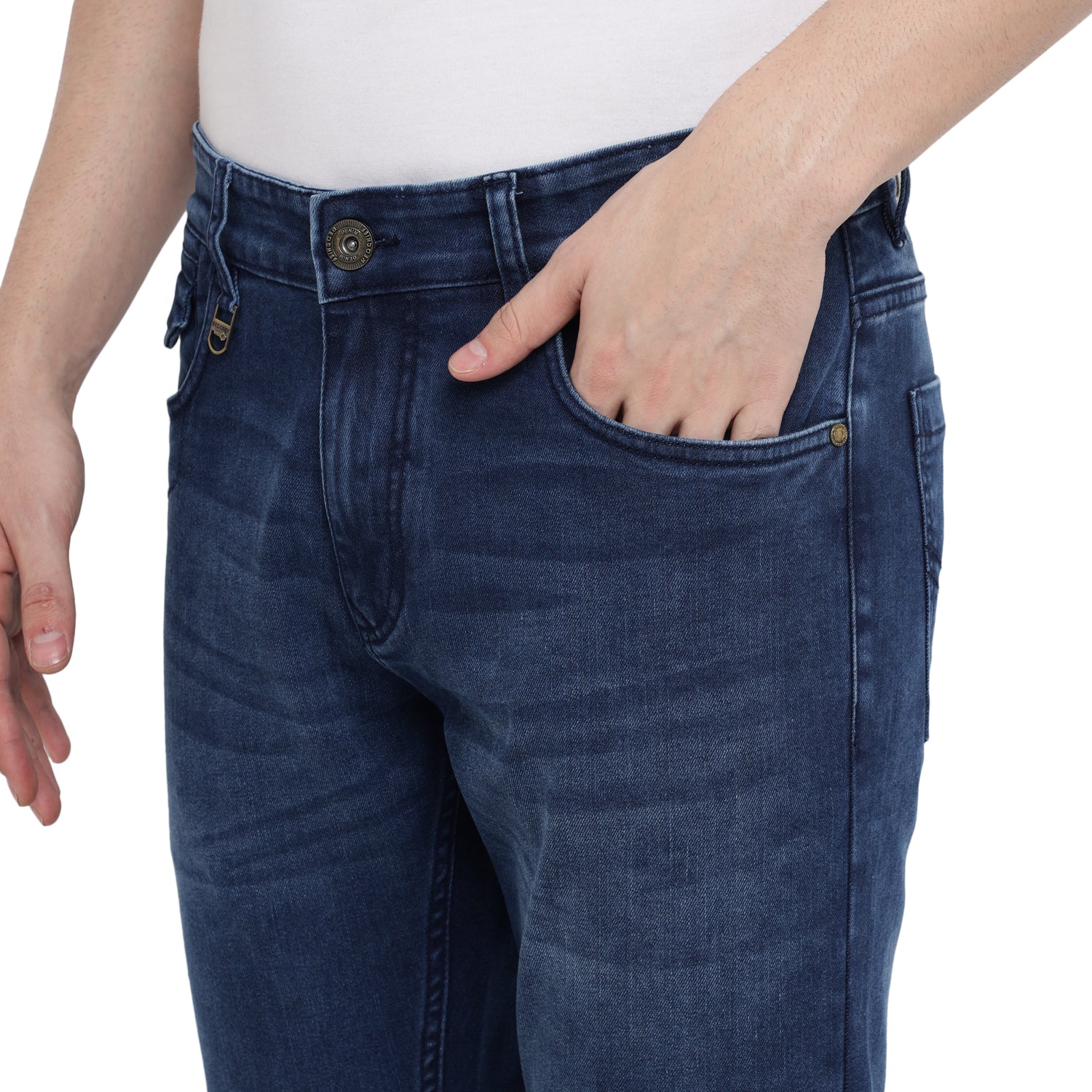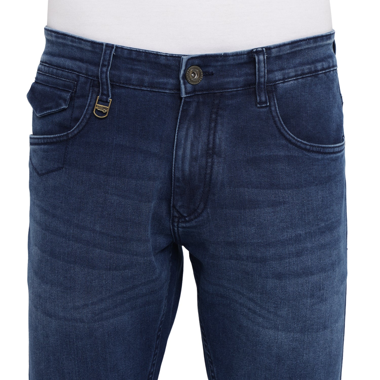 Elevate your casual style with these navy narrow fit denim jeans. Crafted with precision, these men's jeans feature enzyme wash with hand scrapping and whiskers, delivering a trendy, worn-in look. Equipped with anti-brass metal branding buttons, elegant tri-color flag label, and sophisticated DTM color embroidery on back pockets, these jeans blend fashion and functionality seamlessly. Perfect for men seeking comfort and contemporary design.