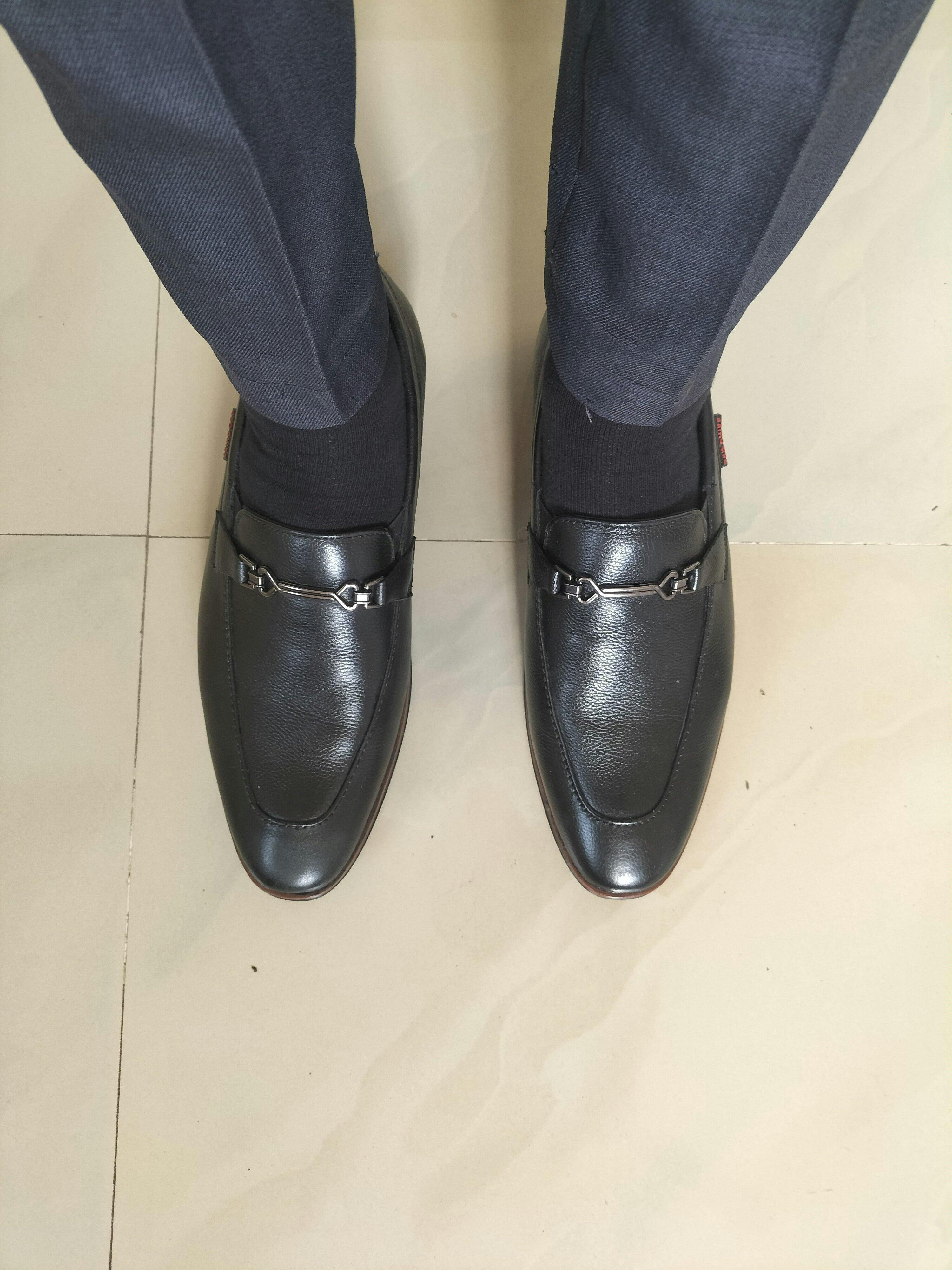 Benefits: RC3962 001 A pair of black Loafers shoe is made in high quality pdm leather which known for its durability and rich texture. The metal saddle detail not only adds a classic element but also elevates the loafer's design, suitable for both formal and business casual attire. A very soft leather lining and cushioned textile lining used which is moisture absorbing, odor controlling and breathability properties. TPR outsole with excellent flexibility, Slip Resistance and durability properties. For comfortness soft cushioning leather insocks inserted.