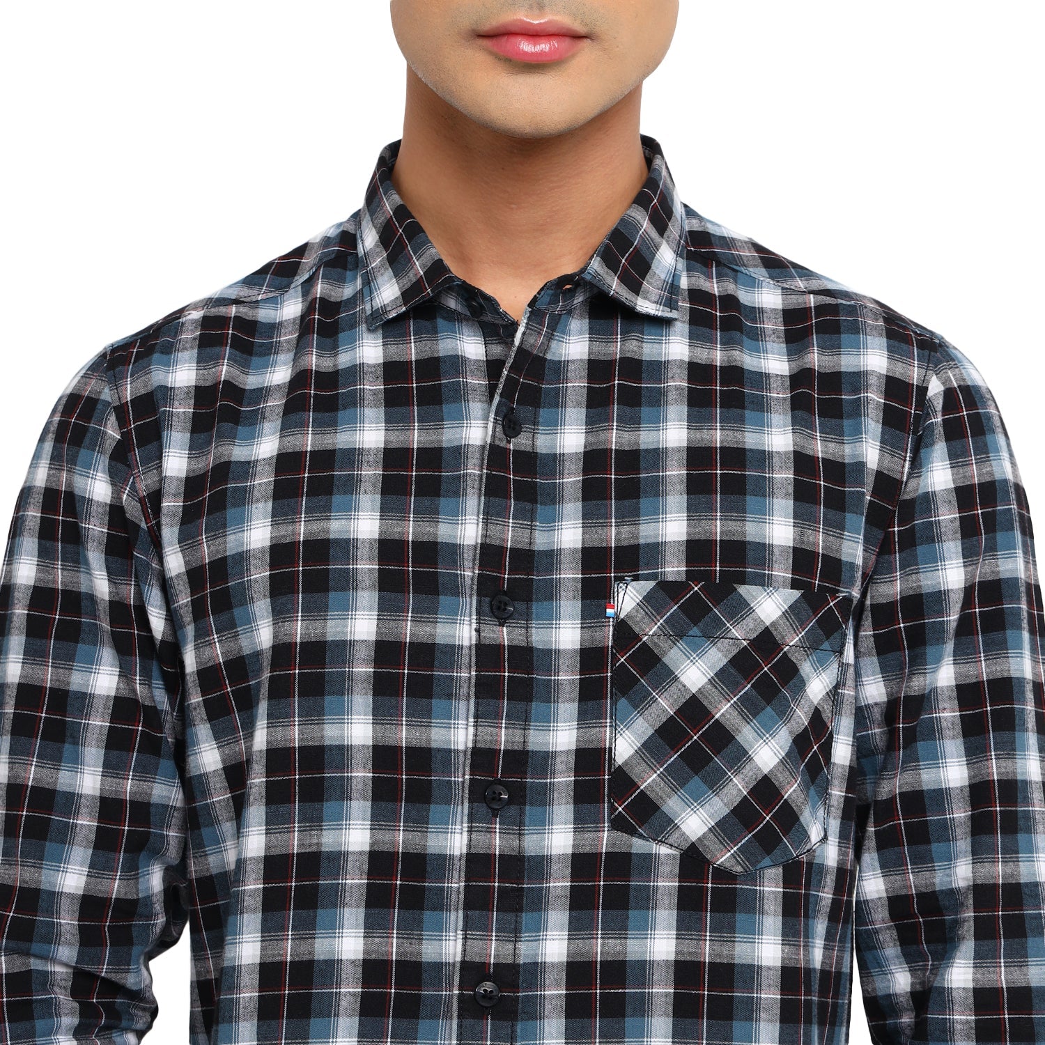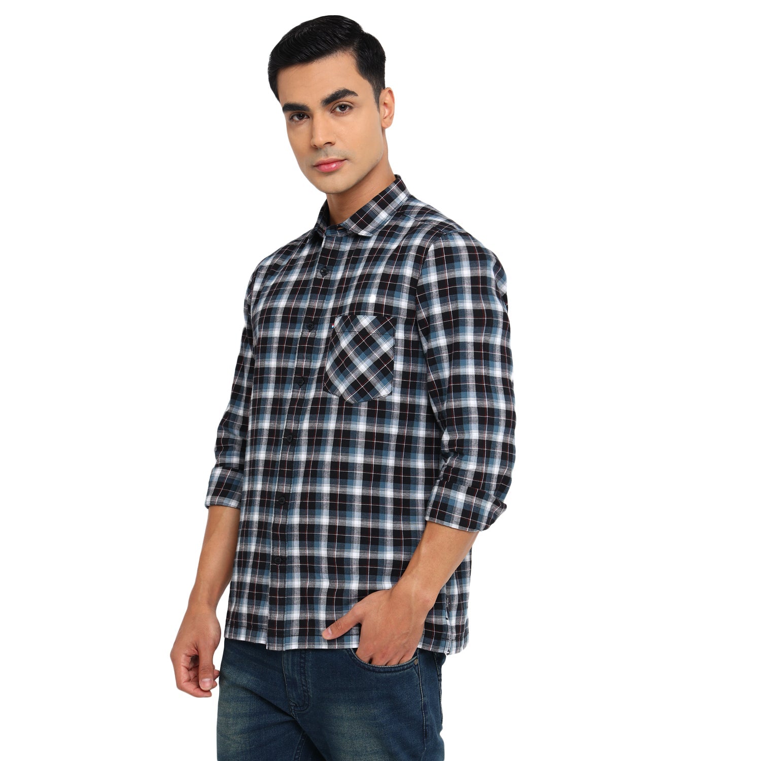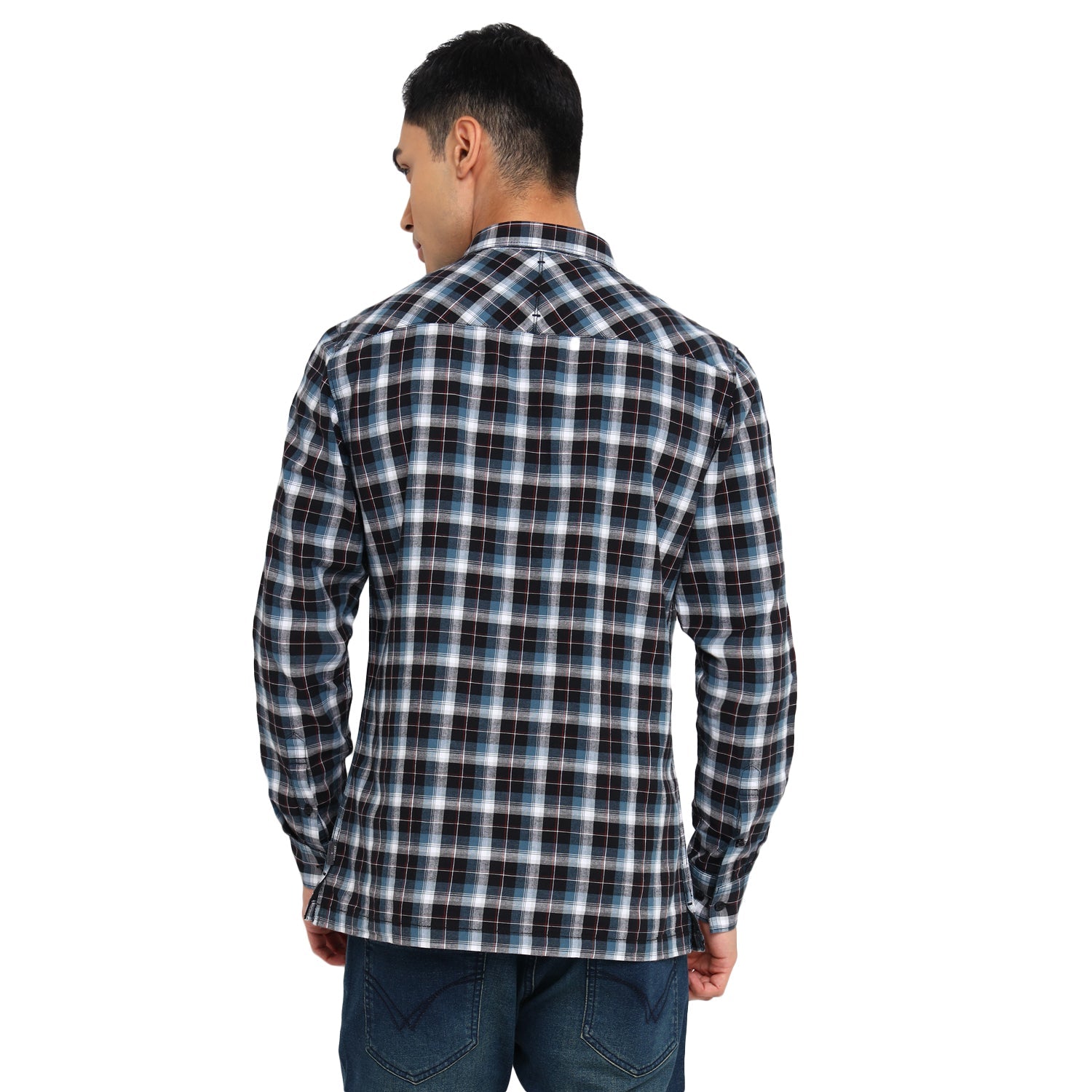 Showcase your impeccable fashion sense with this casual shirt by Red Chief. Finely tailored, it displays a charming interplay of blue, white and black. Highlighted with a check pattern, it features a regular spread collar, box placket and square cuffs. Made of soft fabric, it is finished with a pocket on the left chest. Team this shirt with flat-front chinos or casual jeans and finish off the look with classic sneakers.