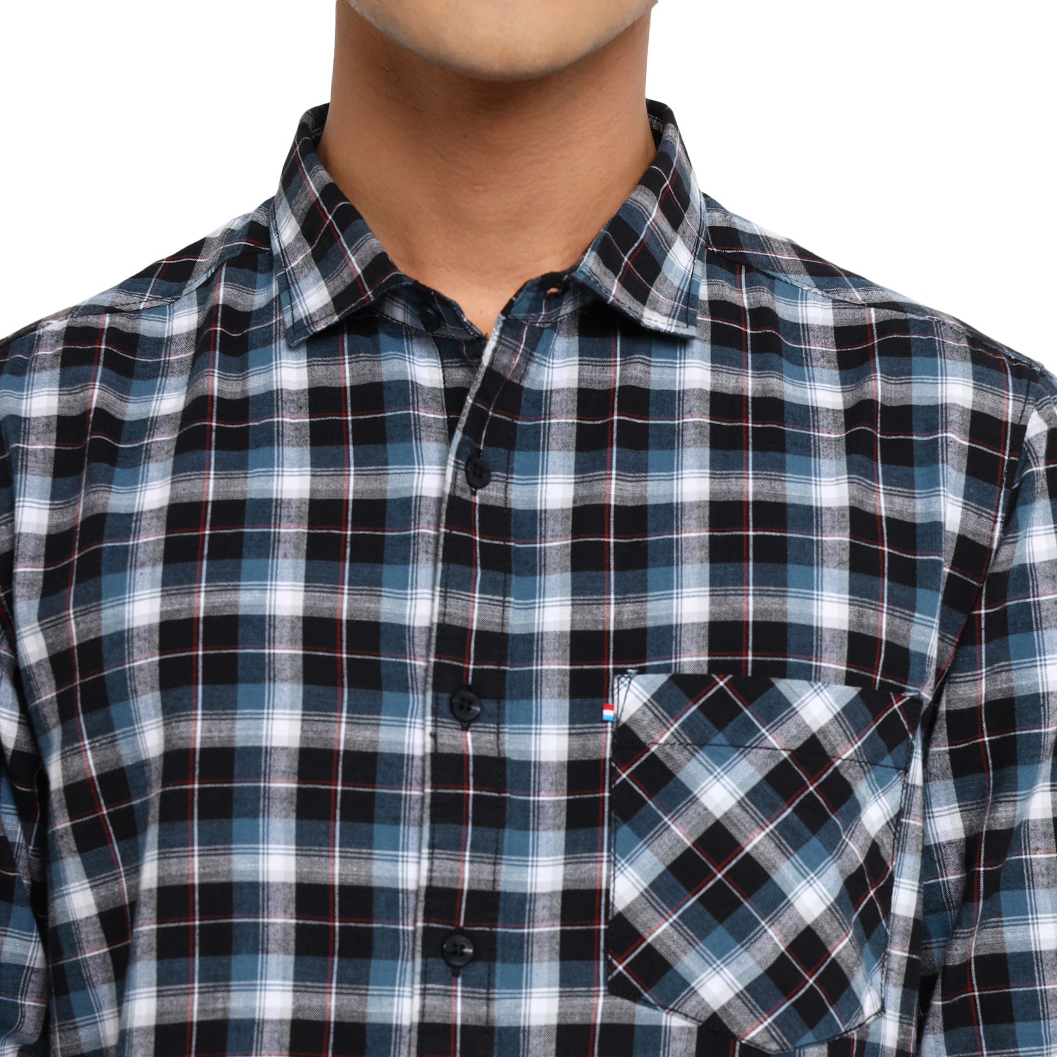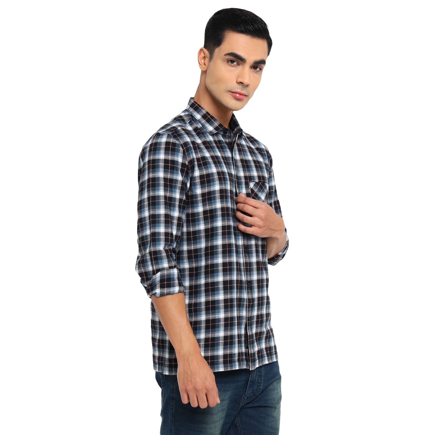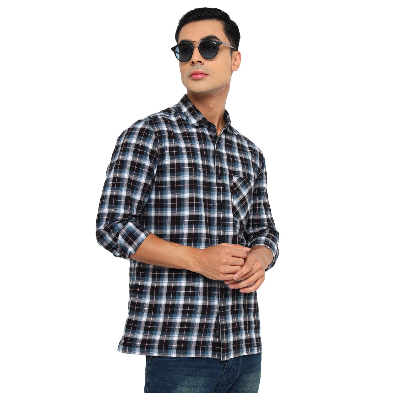 Showcase your impeccable fashion sense with this casual shirt by Red Chief. Finely tailored, it displays a charming interplay of blue, white and black. Highlighted with a check pattern, it features a regular spread collar, box placket and square cuffs. Made of soft fabric, it is finished with a pocket on the left chest. Team this shirt with flat-front chinos or casual jeans and finish off the look with classic sneakers.