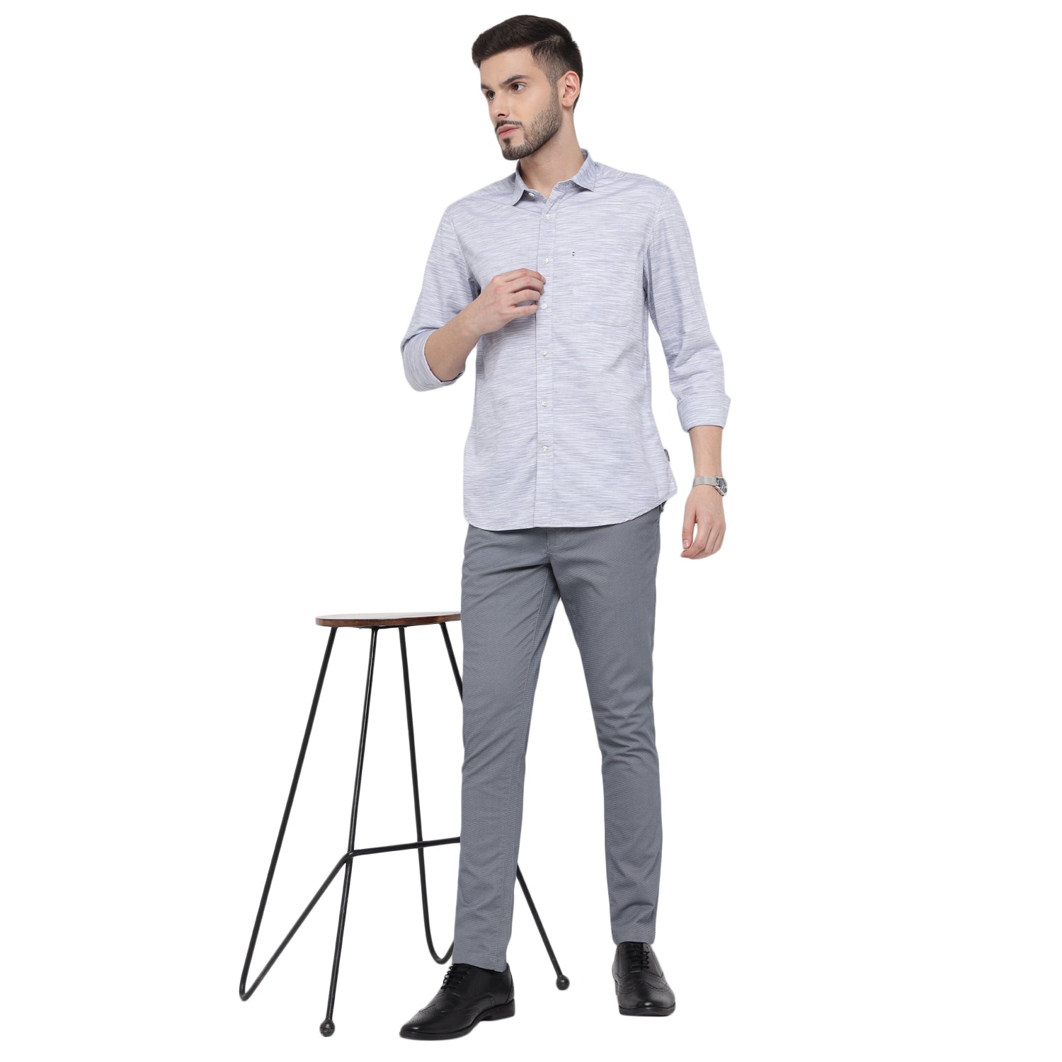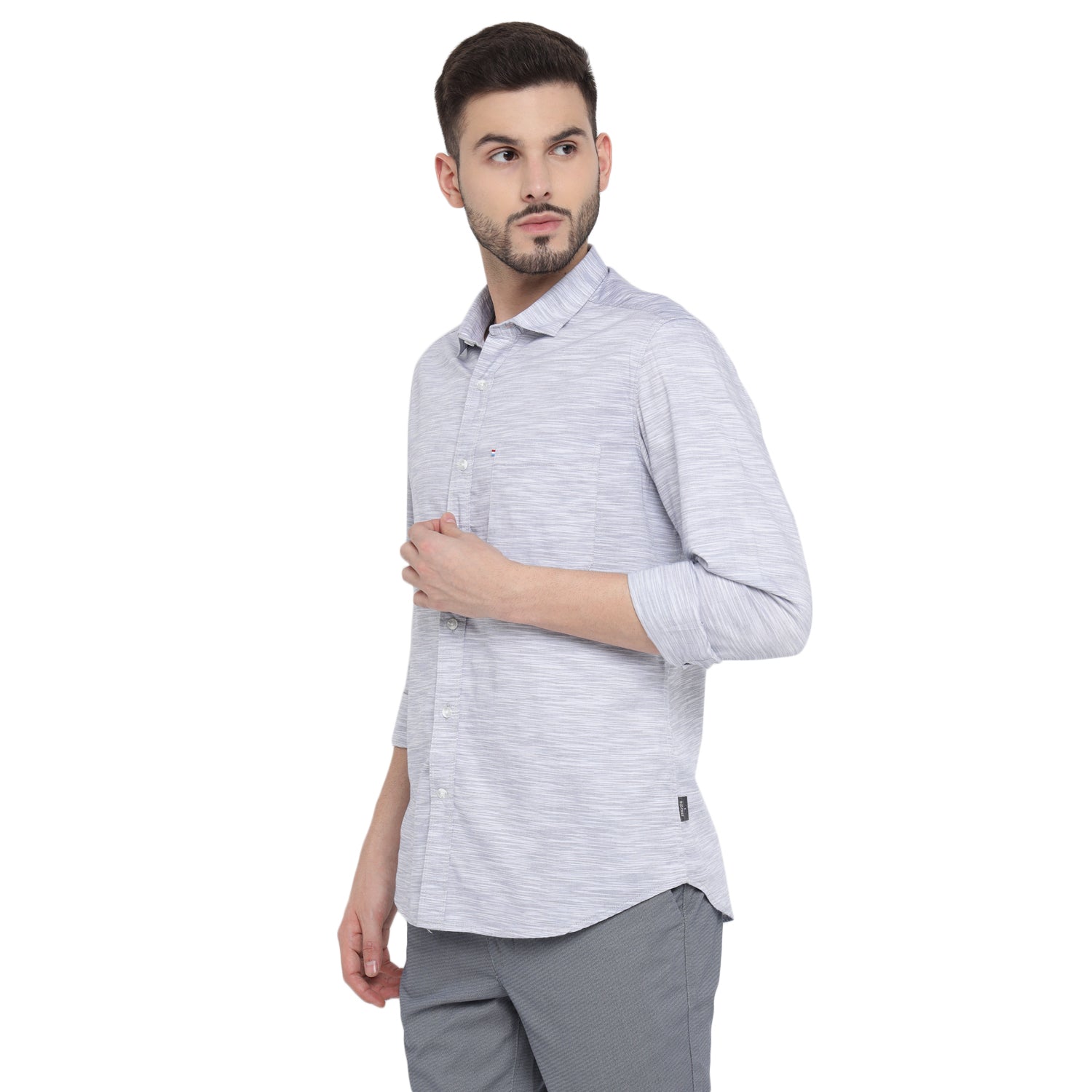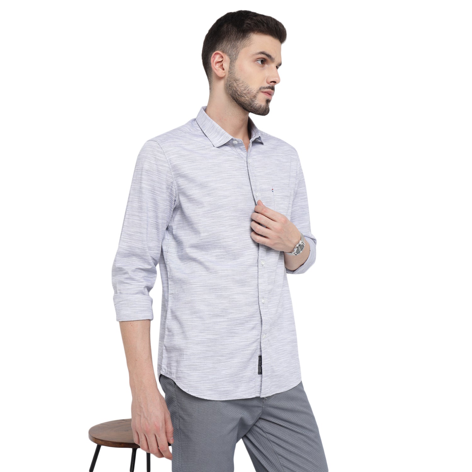 Redefine your professional wardrobe with this sophisticated solid men's full shirt in elegant white and gray. Featuring a refined spread collar, sophisticated square cuffs, and a meticulously crafted box placket with double stitch for enhanced durability. The shirt combines classic design with modern detailing, including a asymmetric metallic finish chest pocket and DTM branding buttons, making it perfect for both office and smart casual occasions.