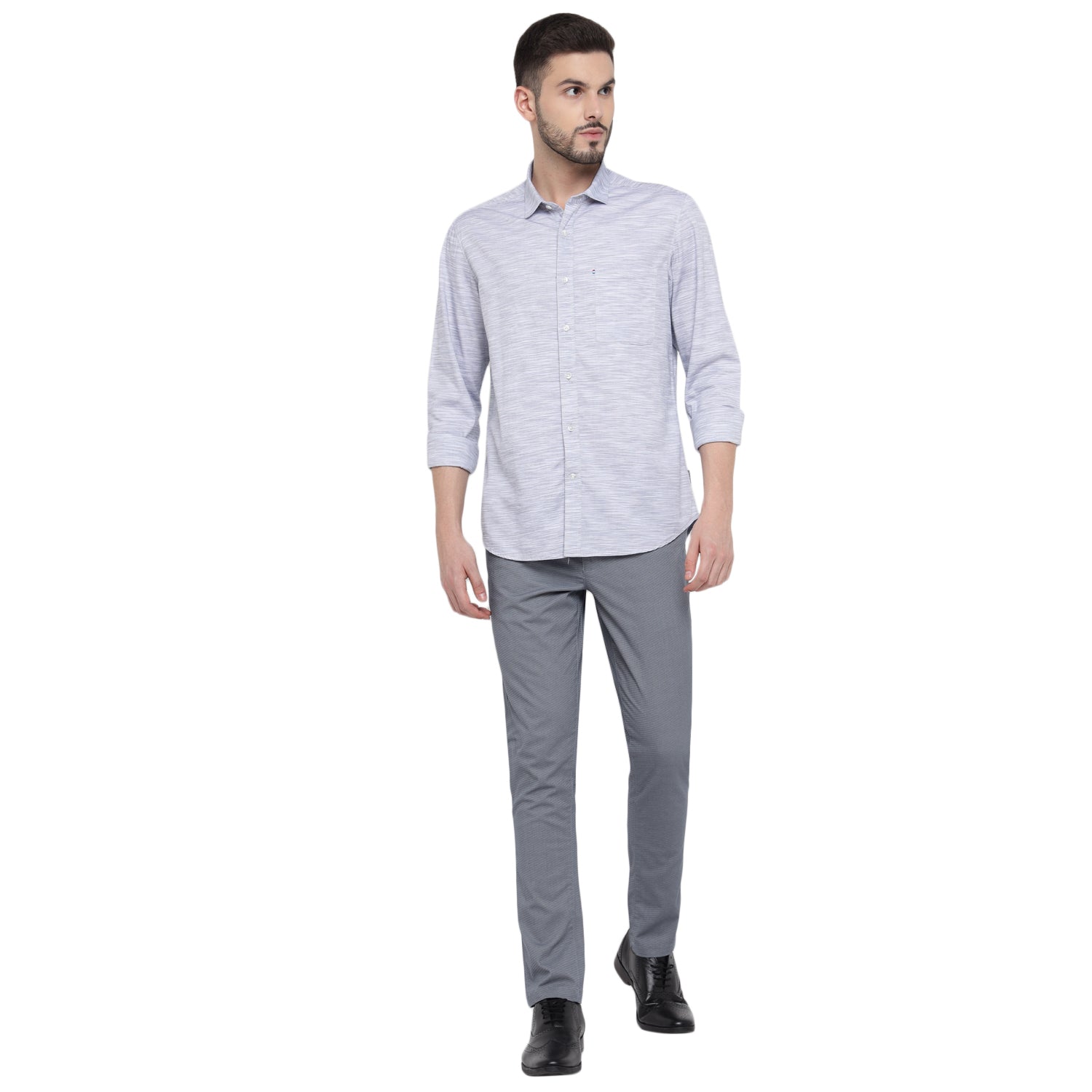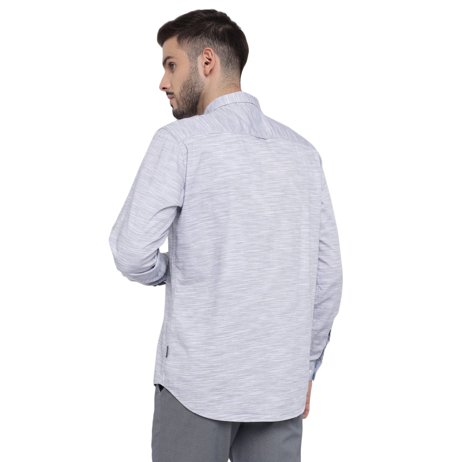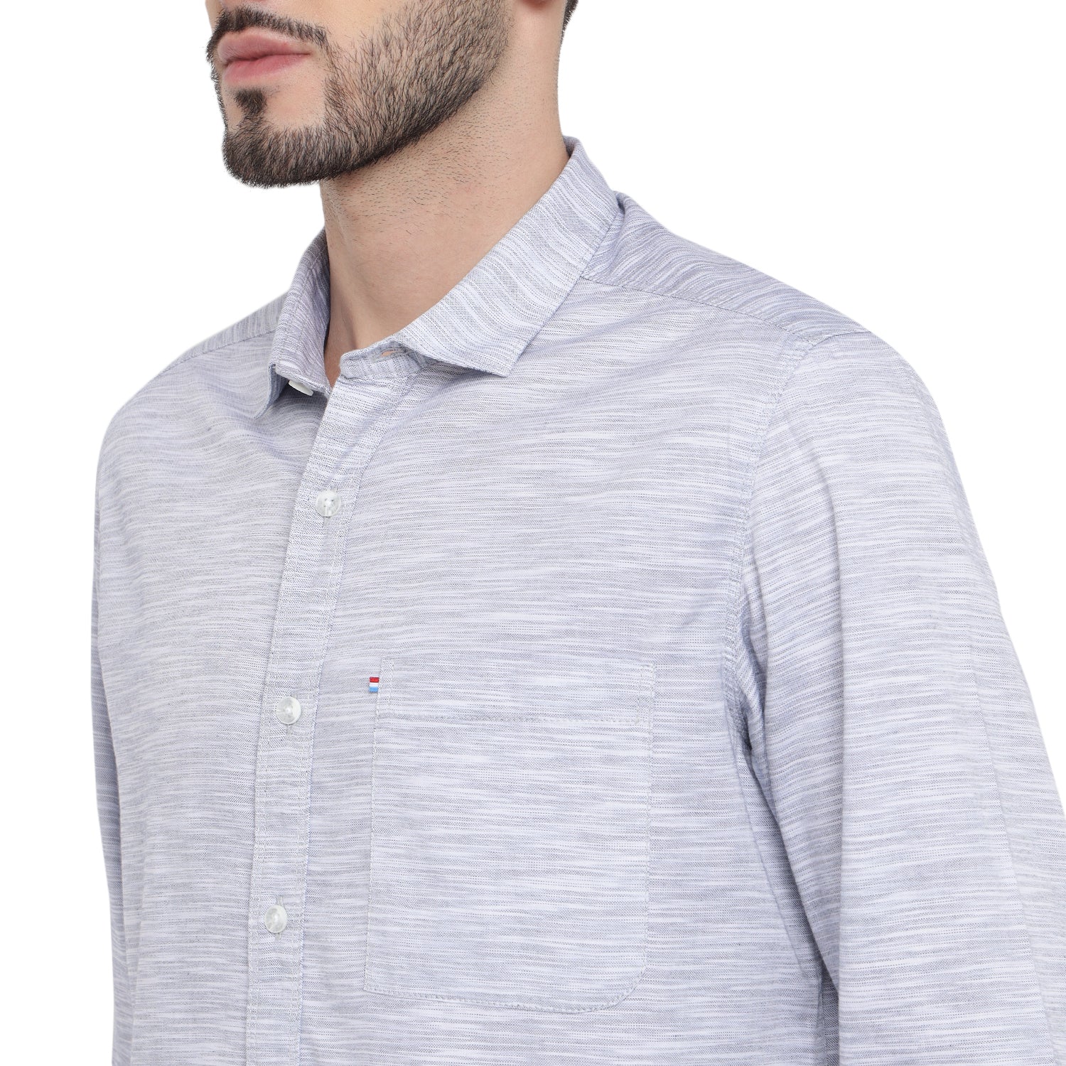 Redefine your professional wardrobe with this sophisticated solid men's full shirt in elegant white and gray. Featuring a refined spread collar, sophisticated square cuffs, and a meticulously crafted box placket with double stitch for enhanced durability. The shirt combines classic design with modern detailing, including a asymmetric metallic finish chest pocket and DTM branding buttons, making it perfect for both office and smart casual occasions.
