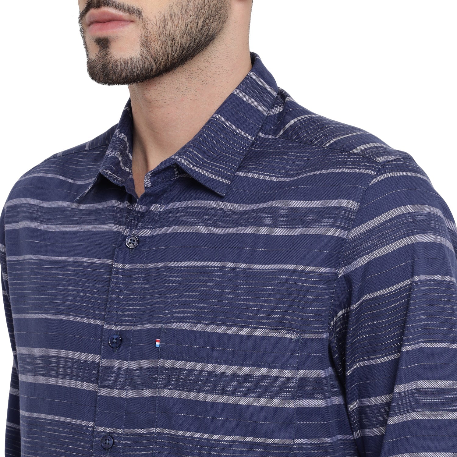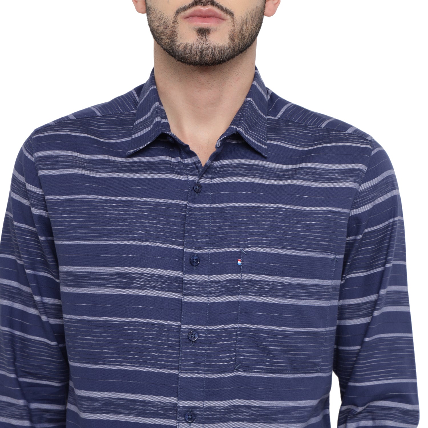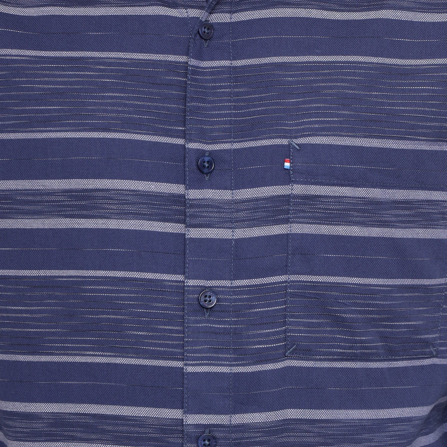 Upgrade your wardrobe with this sophisticated blue regular fit full shirt, crafted with precision and style. Featuring a classic regular collar, elegant square cuffs, and a turn placket with edge top stitch for refined finishing. The shirt boasts a stylish blue horizontal stripe design, reinforced with a square chest pocket and durable bartuck detailing. DTM branding buttons add a premium touch to this versatile menswear essential.