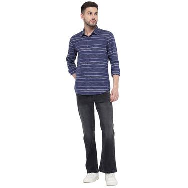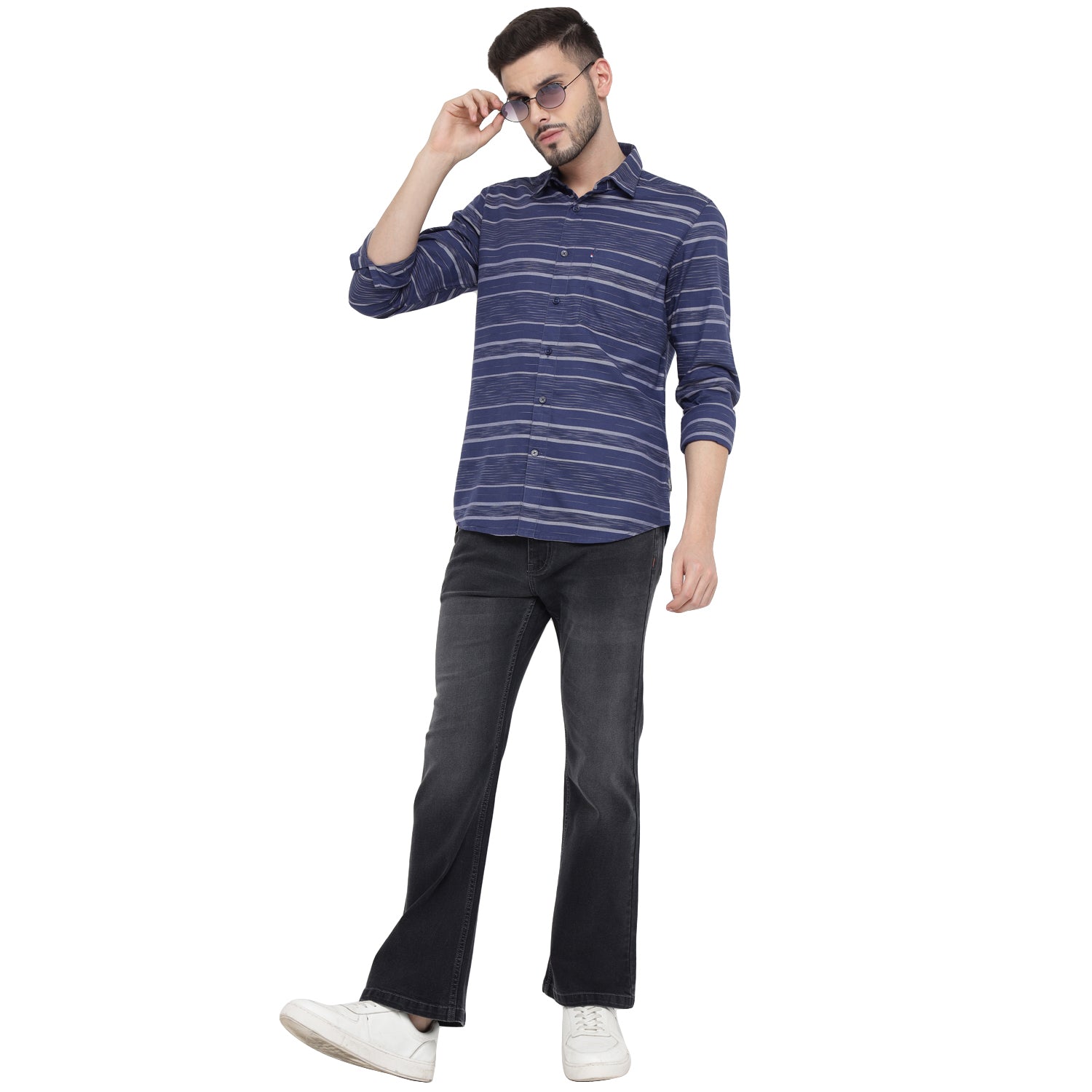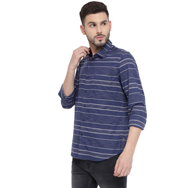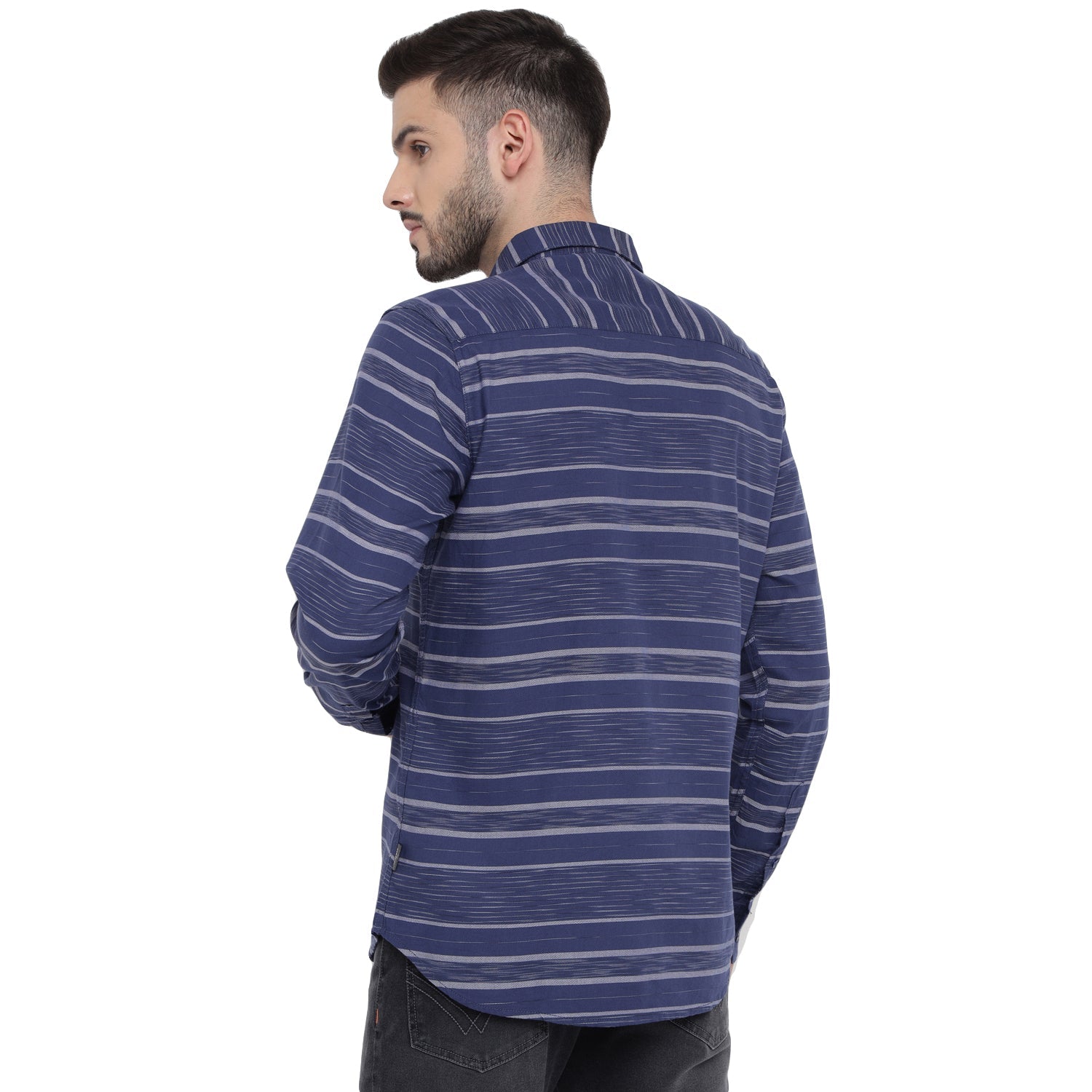 Upgrade your wardrobe with this sophisticated blue regular fit full shirt, crafted with precision and style. Featuring a classic regular collar, elegant square cuffs, and a turn placket with edge top stitch for refined finishing. The shirt boasts a stylish blue horizontal stripe design, reinforced with a square chest pocket and durable bartuck detailing. DTM branding buttons add a premium touch to this versatile menswear essential.