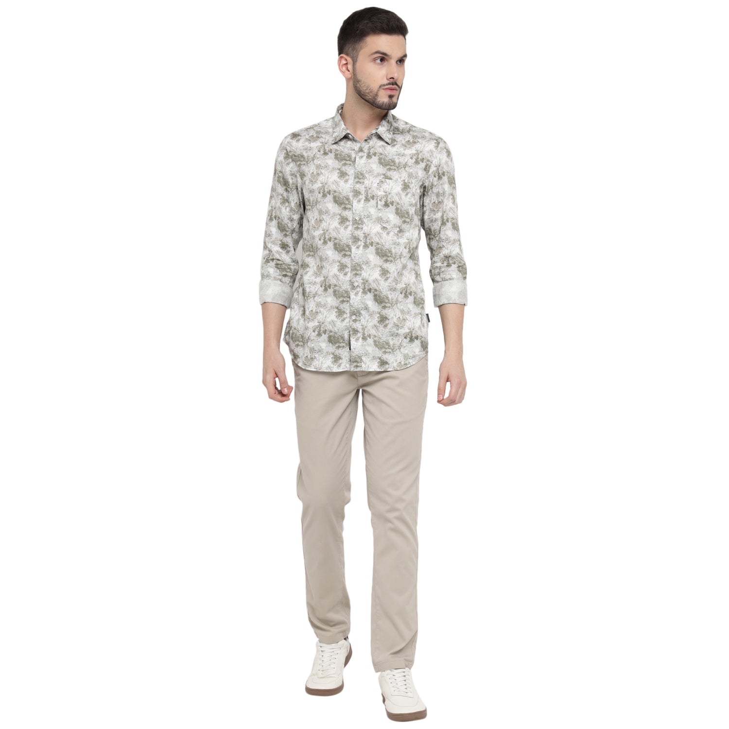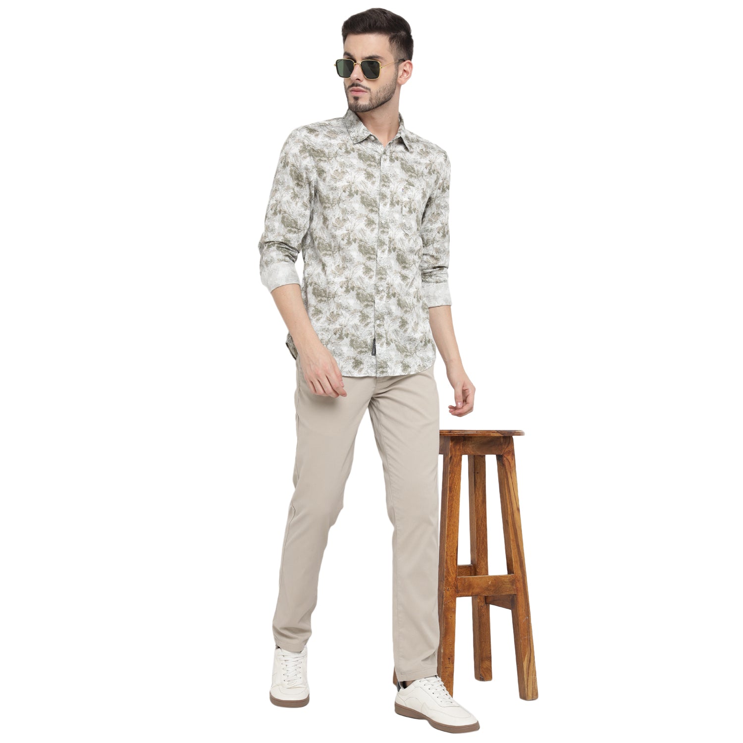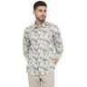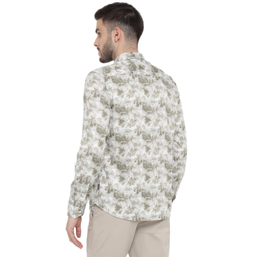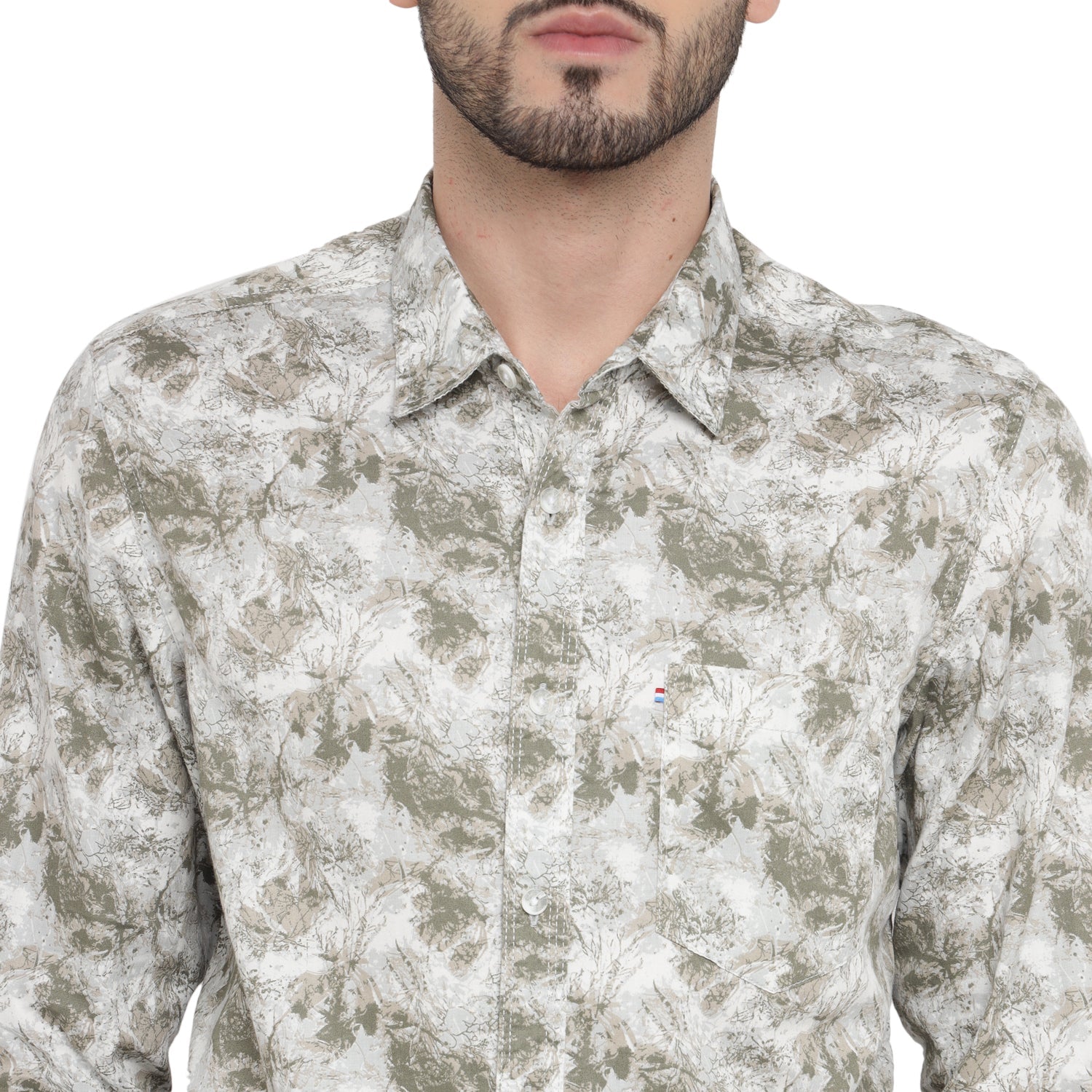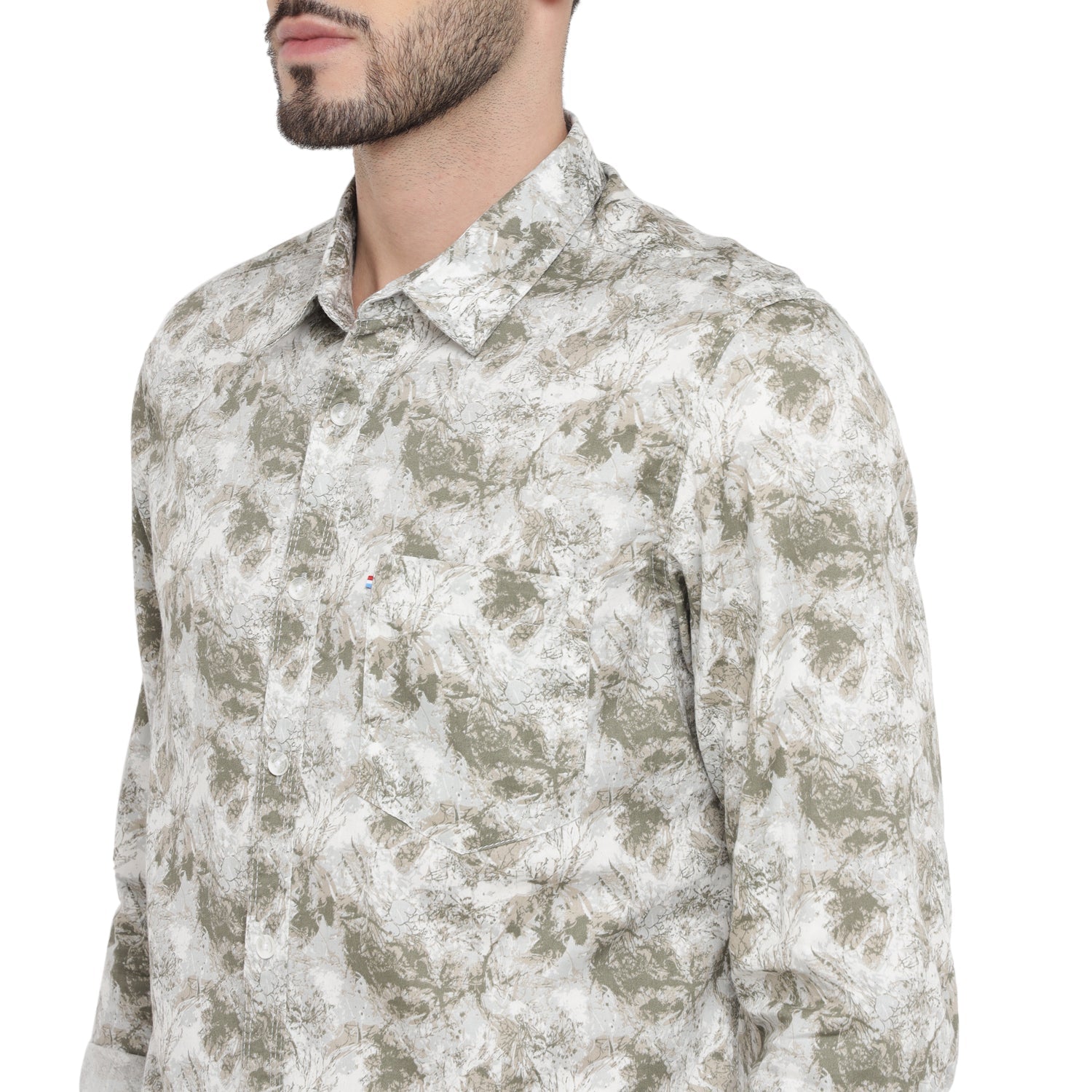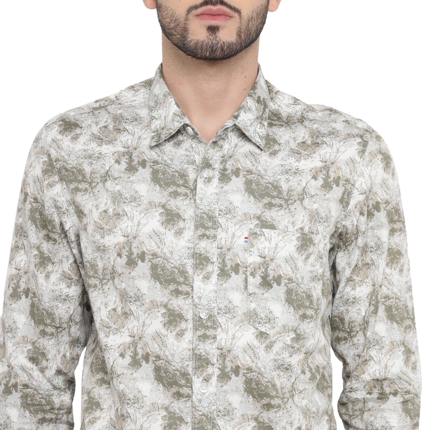 Stand out in style with this white regular fit full shirt featuring an eye-catching abstract camo print in white and green. Crafted in luxurious satin weave, this shirt boasts elegant details like French cut cuffs and a pointed chest pocket. The box placket features premium triple stitching for durability, while the regular collar and chinese hem add refined touches. Complete with DTM branded buttons, this machine-washable shirt combines sophistication with modern design.