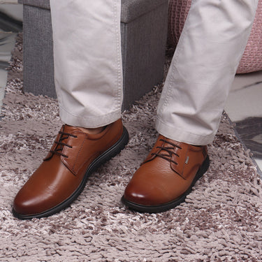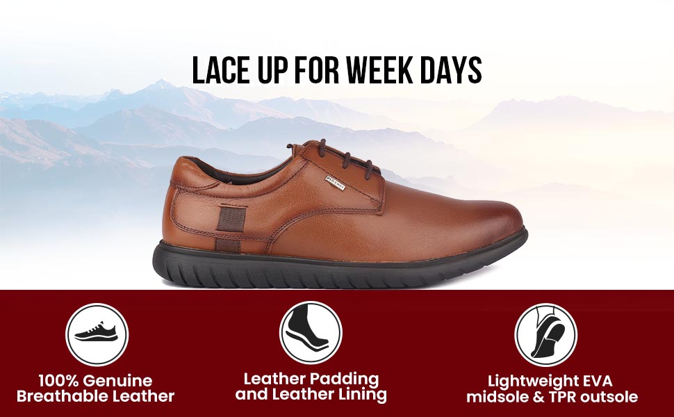 Bringing back the classic style Red Chief presents these tan formal derby shoes lending the timeless vibe and appeal. These smooth-finish shoes have slip-resistant EVA outsole preventing you from slips and falls. Characterised by side branding and open lacing on the top these ultra-breathable and odor-resistant shoes are a must-have for every modern man.