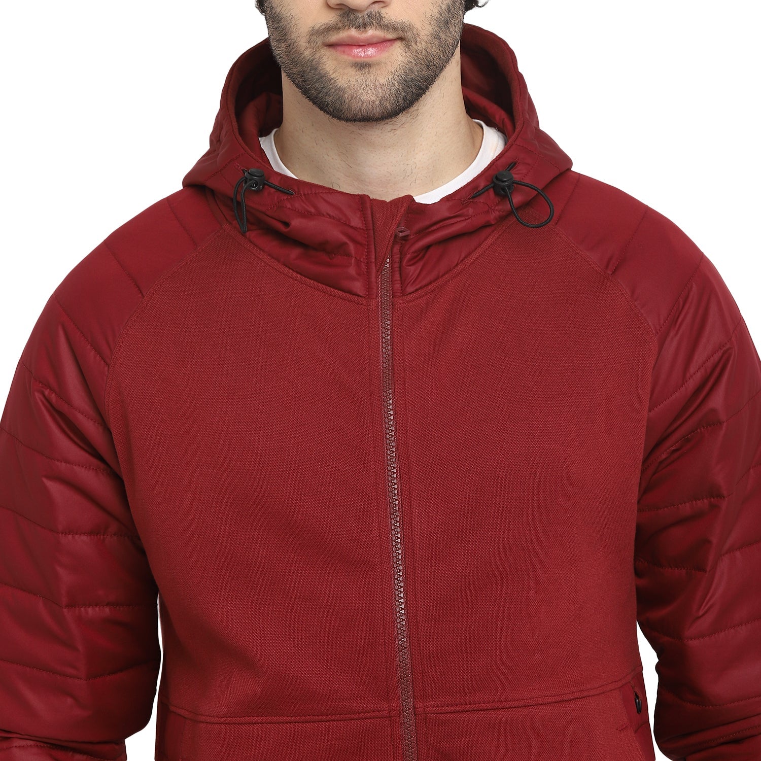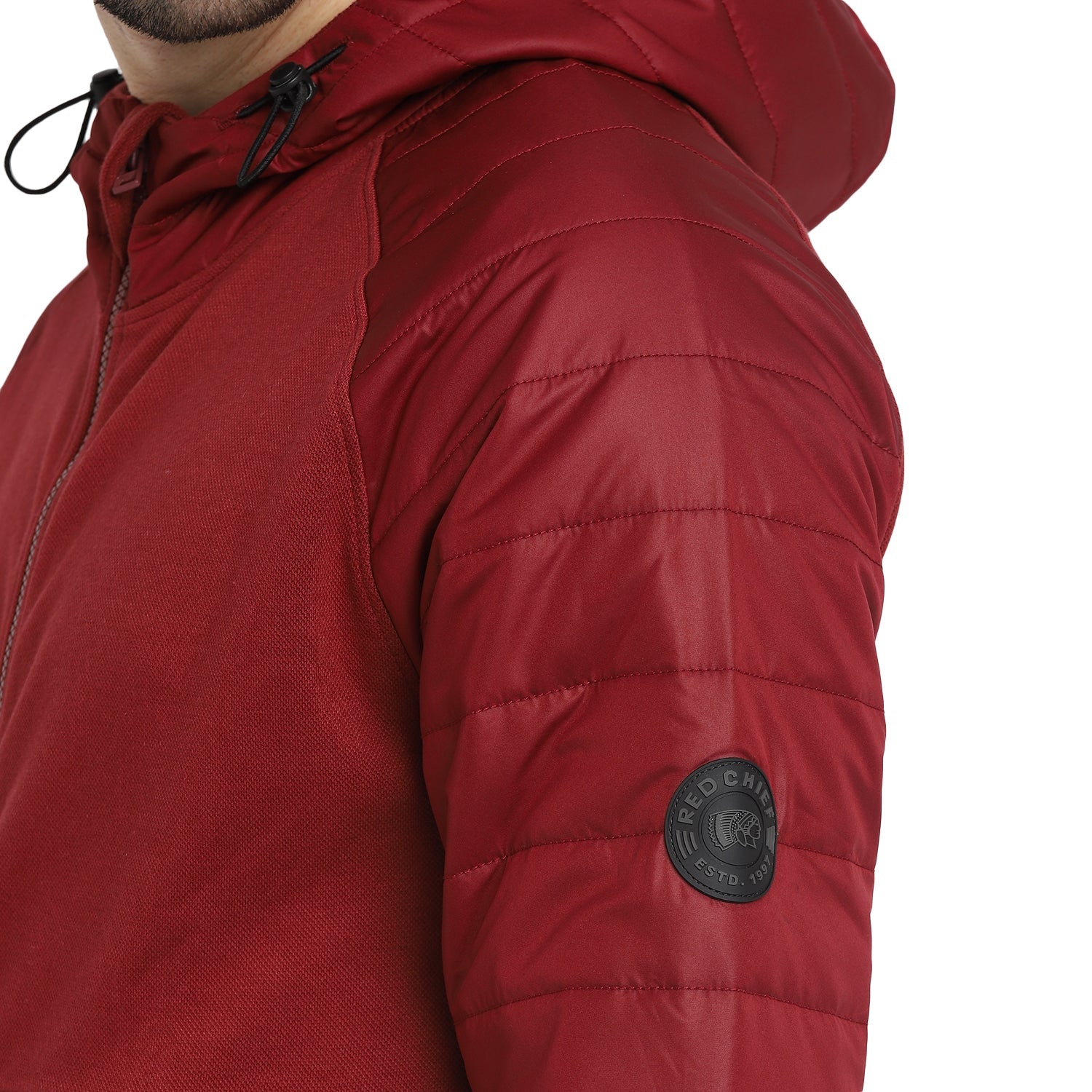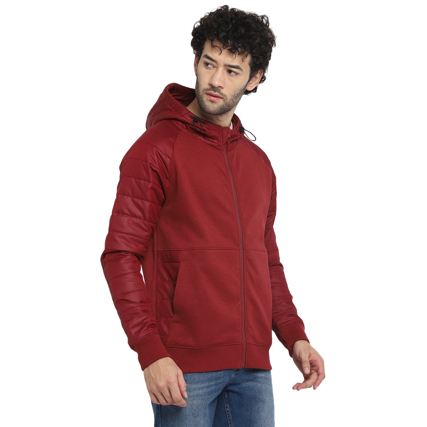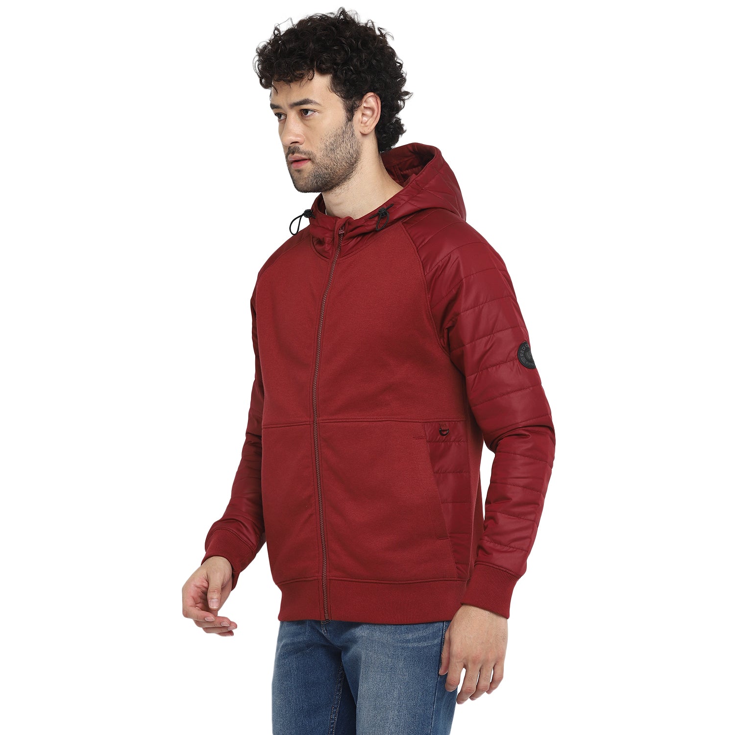 Instantly elevate your casual style with this hooded maroon sweatshirt by Red Chief. Designed in a front-zipper silhouette, this hybrid sweatshirt features telon quilted long sleeves for a cosy feel, and a D-ring for utility purposes. Its pique interlock fabric further ensures a comfortable and flattering fit. Wear it best with jeans and sneakers.