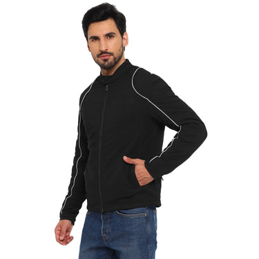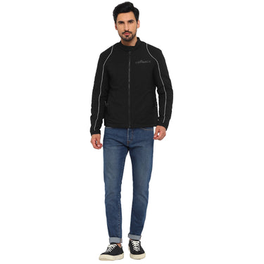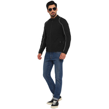 A trendy and functional biker jacket in classic black. This Red Chief casual jacket comes in a solid pattern complemented by reflector cord piping on the shoulder and sleeves, making it visible even in the dark. Having polyester textured dobby base fabric with motojack print on the chest, this comfortable jacket looks fantastic with any jeans or chinos.