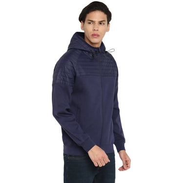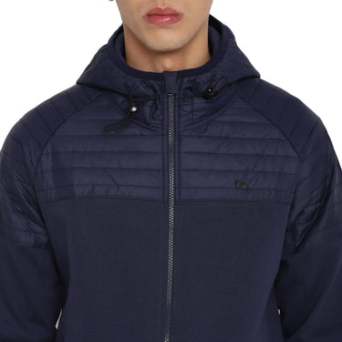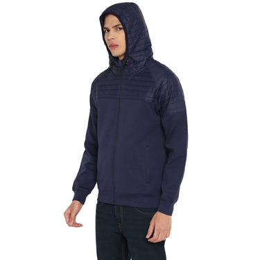 A hybrid sweatshirt by Red Chief. This navy front-zipper sweatshirt features Teflon fabric on the upper half with a quilted pattern for edgy vibes. The metal brand face on the chest further speaks for the exclusive appeal of this hooded sweatshirt. Add this trendy piece to your wardrobe for anytime access to a cozy winter feel. Pair it with denim jeans or joggers to look your stylish best.