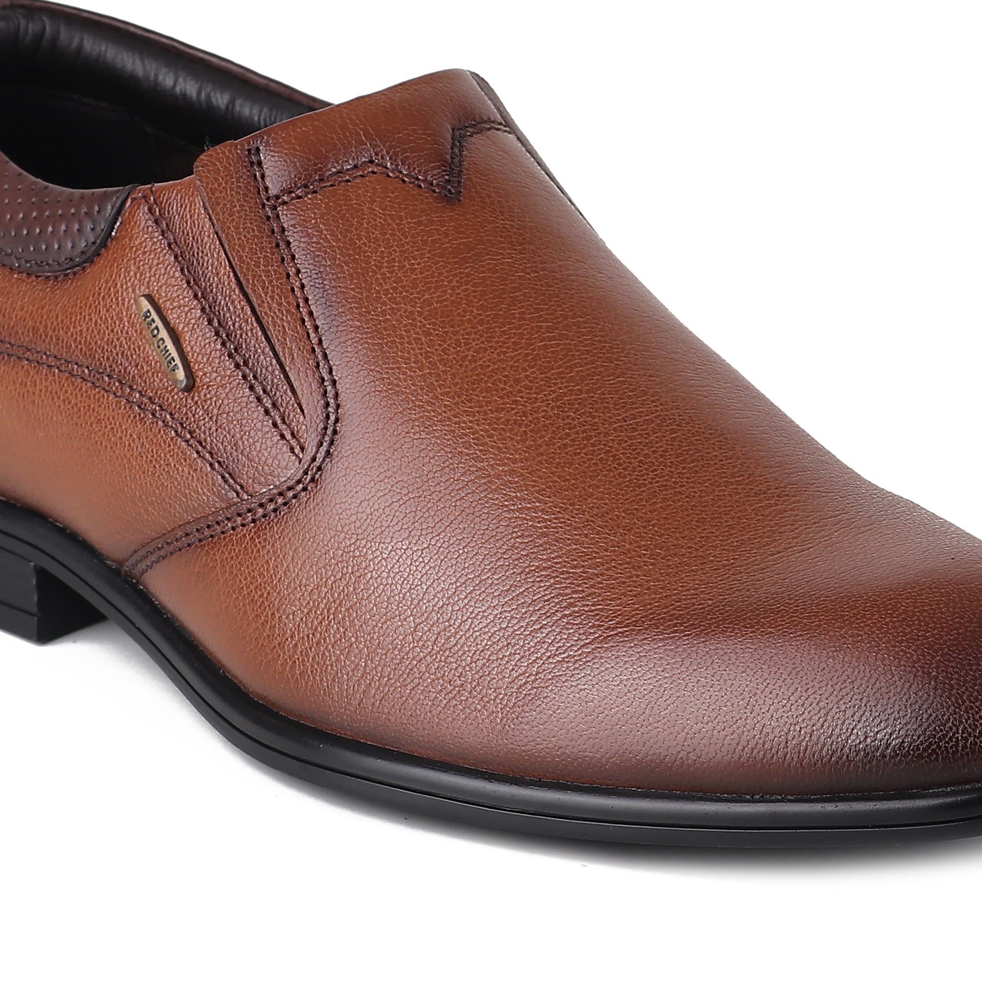 THIS MEN'S BOOTS IS FOR:- These tan round-pointed Red Chief shoes have a slip-on design that provides exceptional comfort and durability. Made from breathable goat leather, the soft cushioned collar ensures a smooth fit, while the engraved punch detailing enhances their stylish appeal for parties.