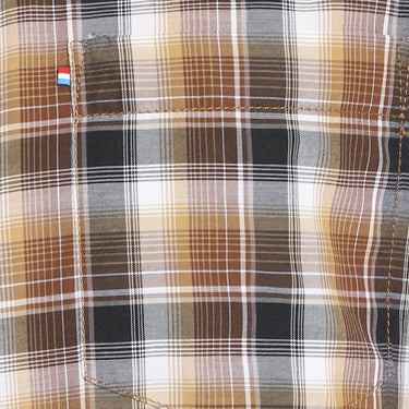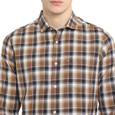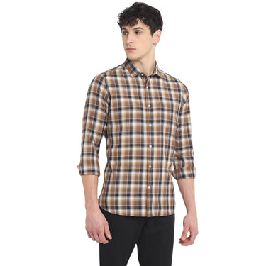 Achieve an effortlessly polished look with confidence in this Red Chief chequered shirt. Highlighted by black and brown checks, the shirt has a spread collar and a pocket for edgy yet preppy vibes. The 5MM Chinese bottom hemline adds a distinctive touch, elevating the overall appeal of this cotton and polyester blend shirt. Style it with any separates for a versatile and stylish ensemble.