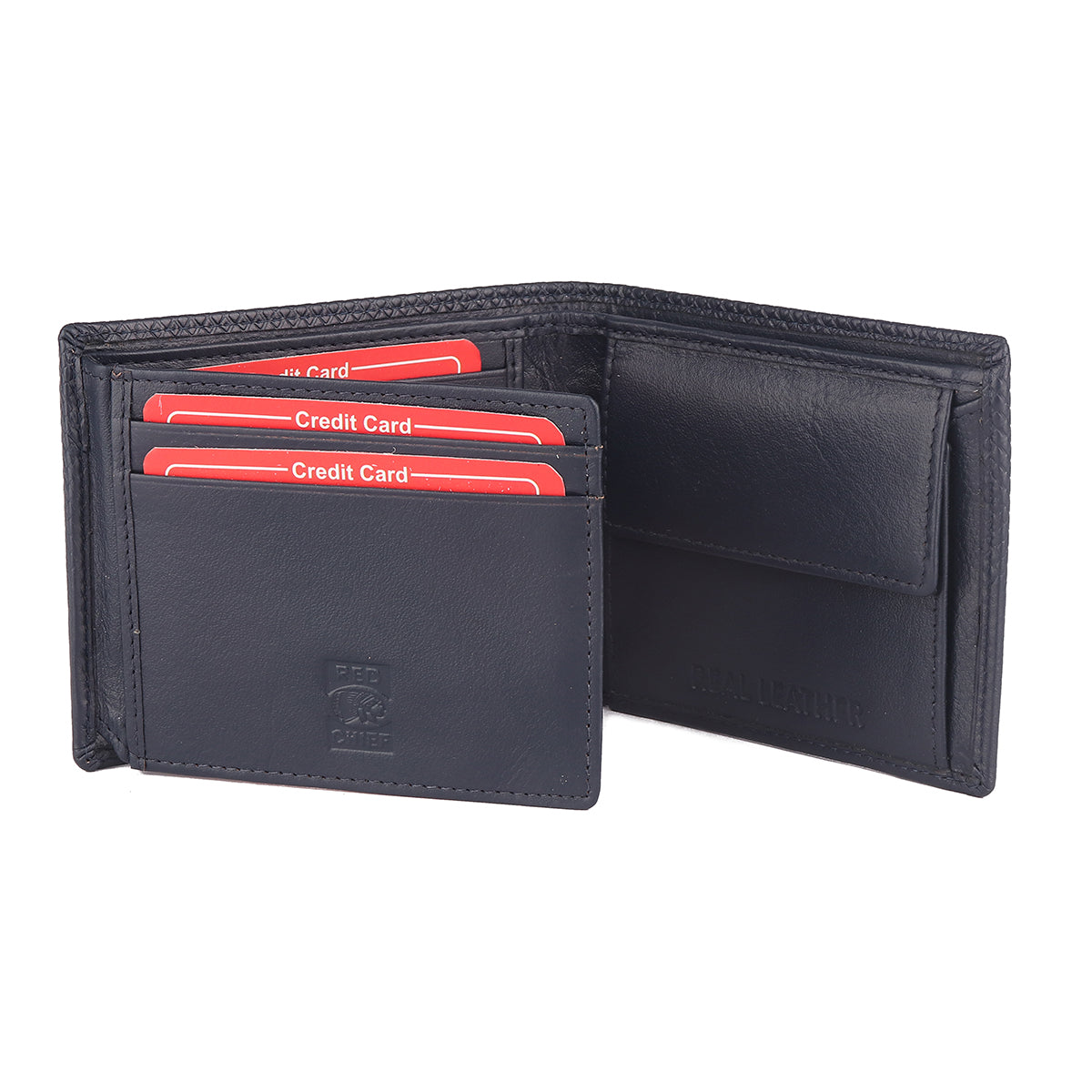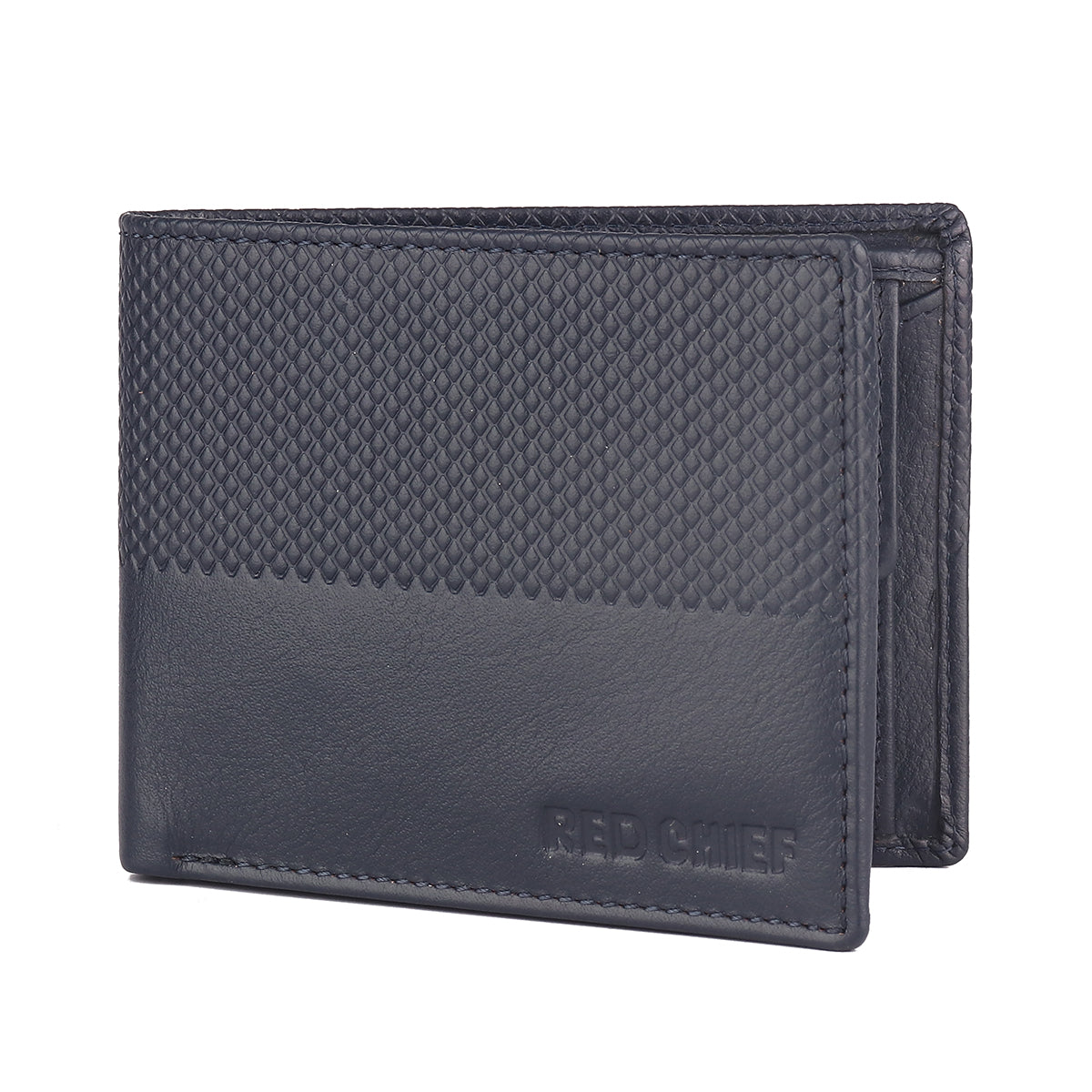 Elevated with half-n-half textured and solid pattern on the exteriors this blue bi-fold leather wallet by Red Chief is a perfect example for fashion meeting functionality. This wallet is equipped with a slip-on pocket and multiple card slots to let you handle your money and other important cards in neat and organised manner.